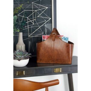 DecMode 15″ Brown Leather Handmade Box Style Magazine Holder with Detail Stitching and Curved Buckle Handle