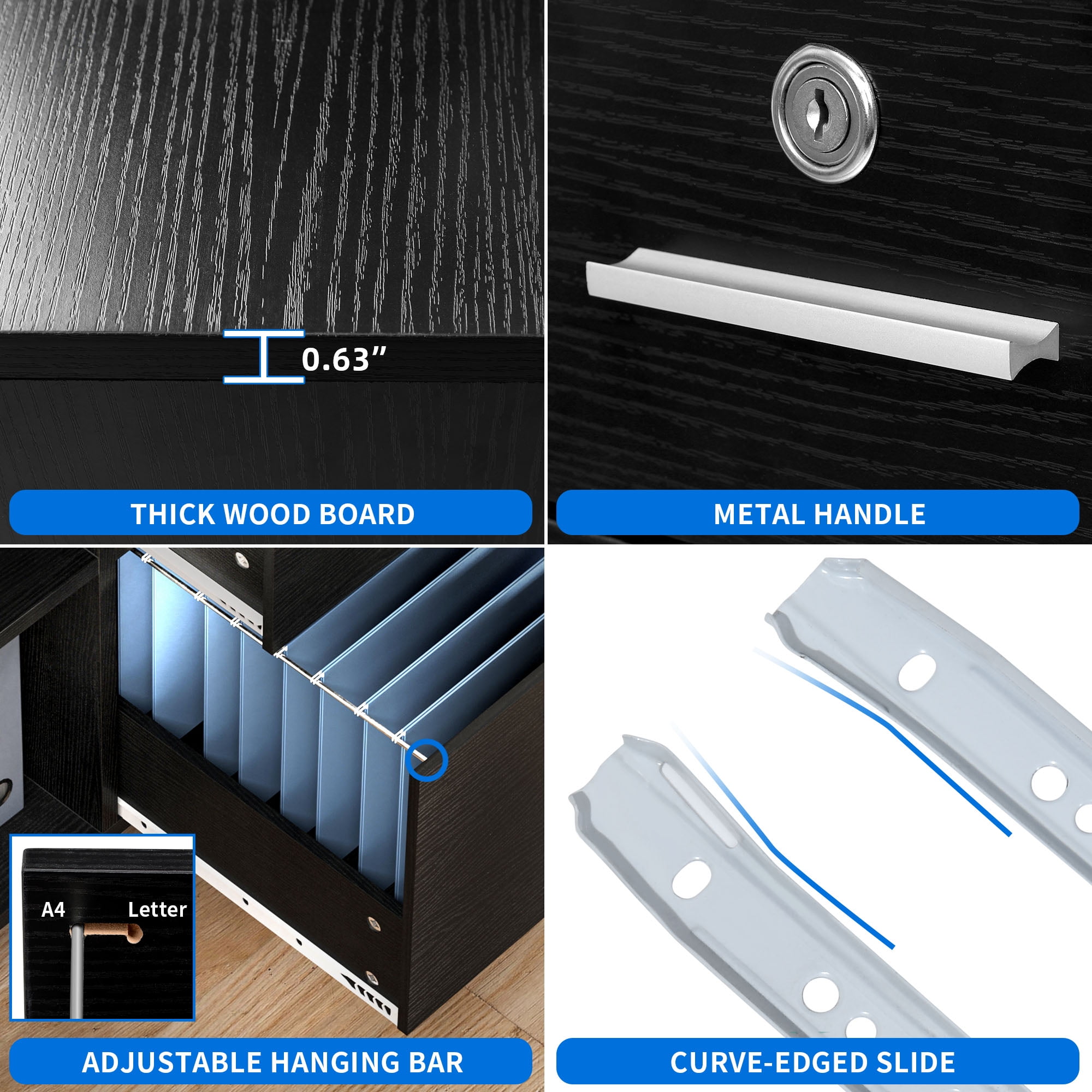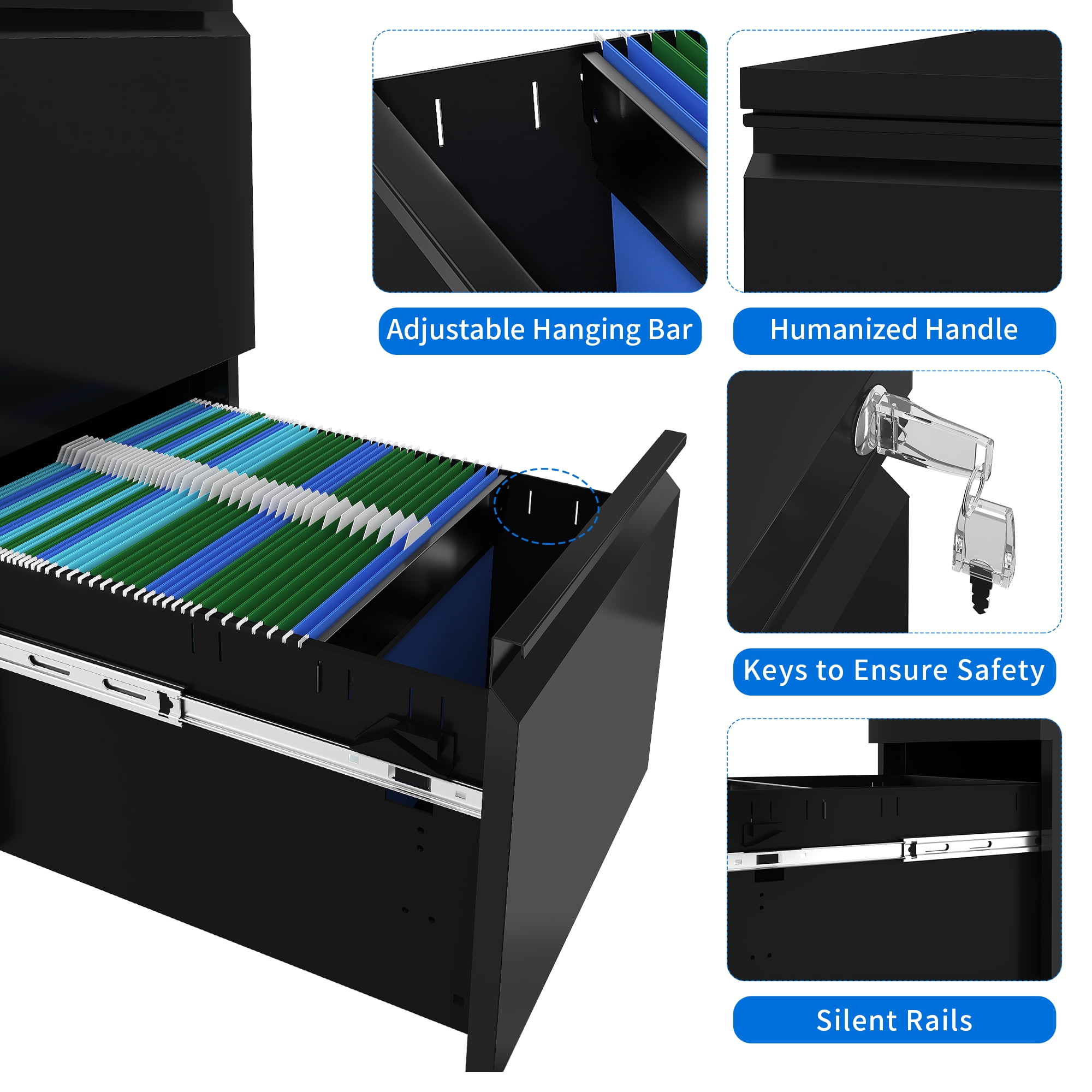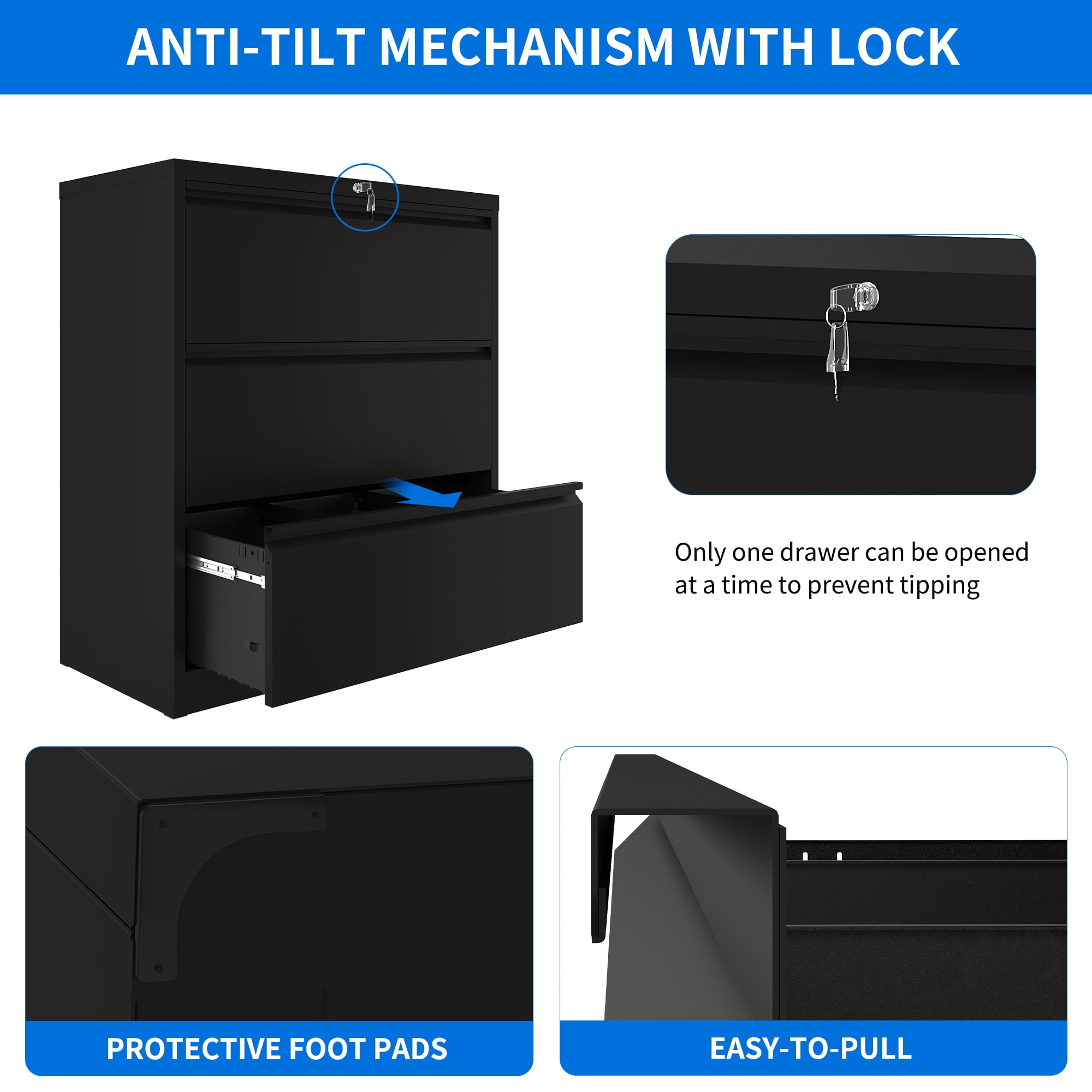 $214.99Product Description Organize your office with the 3-Drawer Lateral File Cabinet. This wide and durable stainless steel cabinet offers ample storage for legal, letter, and A4 size files. The lockable design provides security and privacy, while the footpad protects your floors and reduces noise. With removable hanging bars and full-extension drawer slides, accessing your files is effortless. The spacious drawers and sturdy construction make this file cabinet an essential tool for efficient office organization. Specifications Color: Black Material: Stainless Steel Item Weight: 127 Pounds Product Dimensions: 36 x 18 x 41 inches