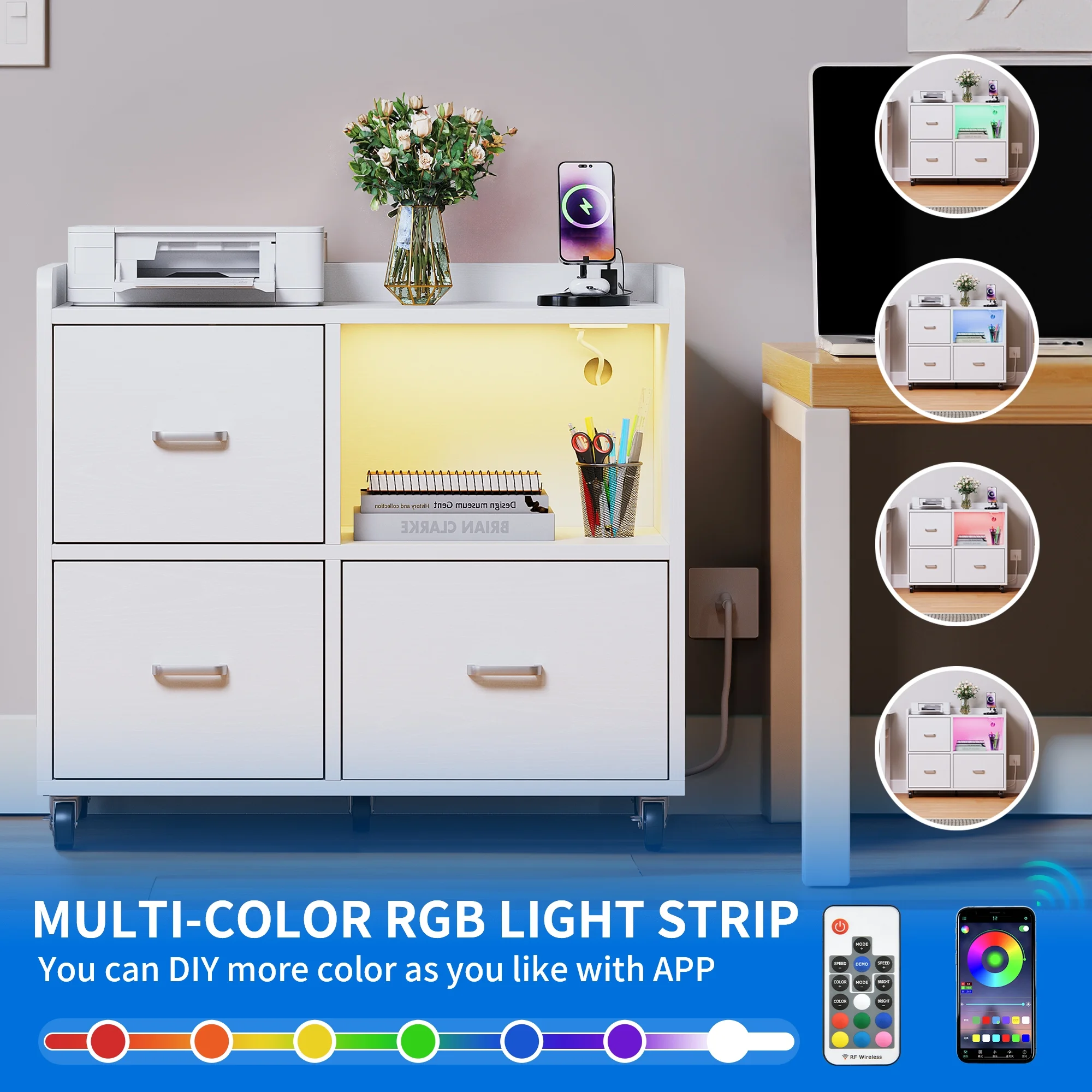 Dextrus 3 Drawer Wood File Cabinet with Charging Station & LED Light, Rolling File Cabinet, White