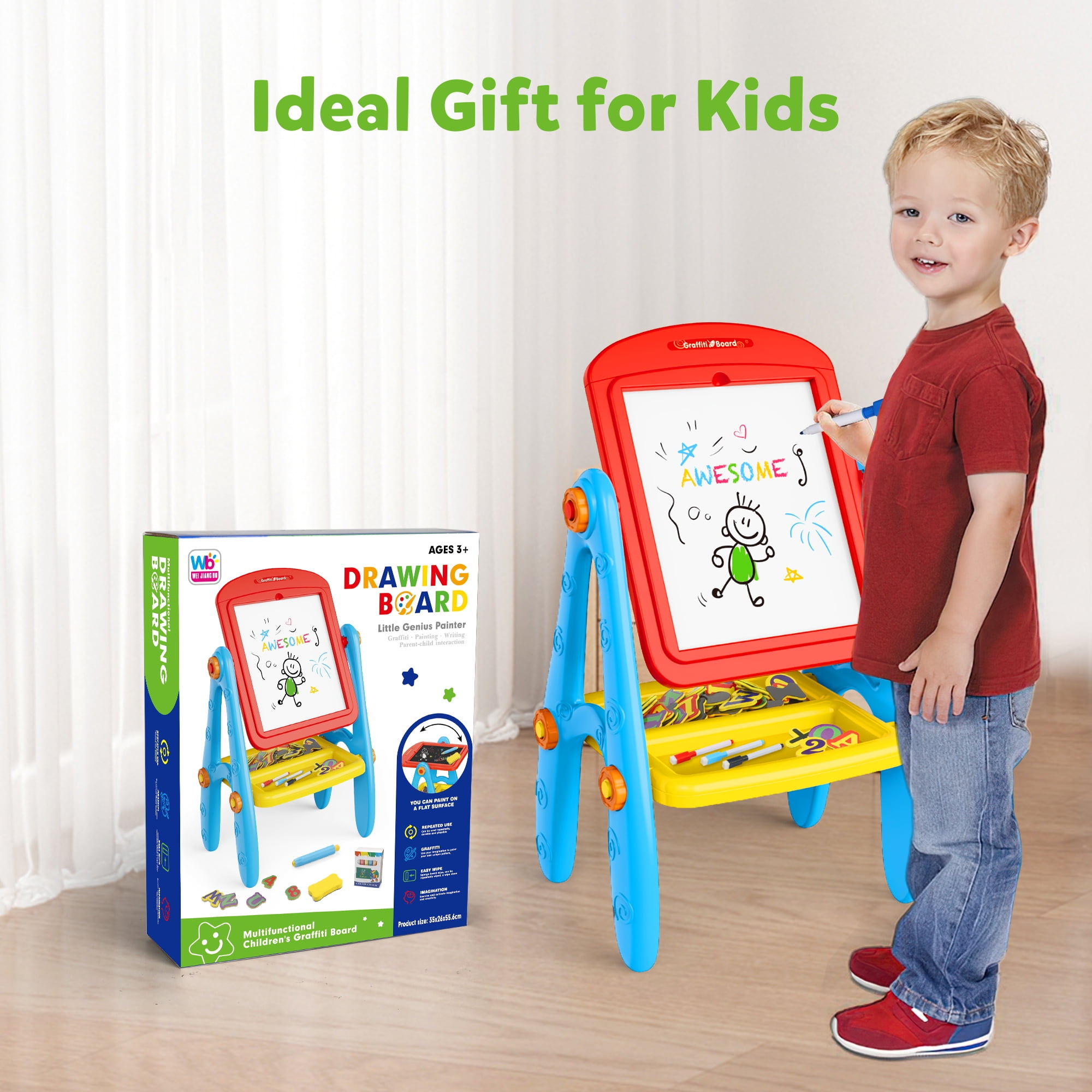 $42.99Original price was: $42.99.$37.83Current price is: $37.83.Blackboard Traditional children’s painting experience, promoting creativity and fine motor skills. Whiteboard Great marker painting and writing, encouraging learning and expression. Magnetic board Interesting interactive learning and playing with magnets can enhance cognitive and motor skills. Paper clip Securely holds the paper for painting and drawing. Increase flexibility in artistic activities. PORTABLE DETACHABLE & ROTATABLE Perfect for parents on the go, this easel is portable and detachable, allowing for easy movement and cleaning. The rotating feature provides convenient access to both the blackboard and the whiteboard, promoting multi-functional use.
