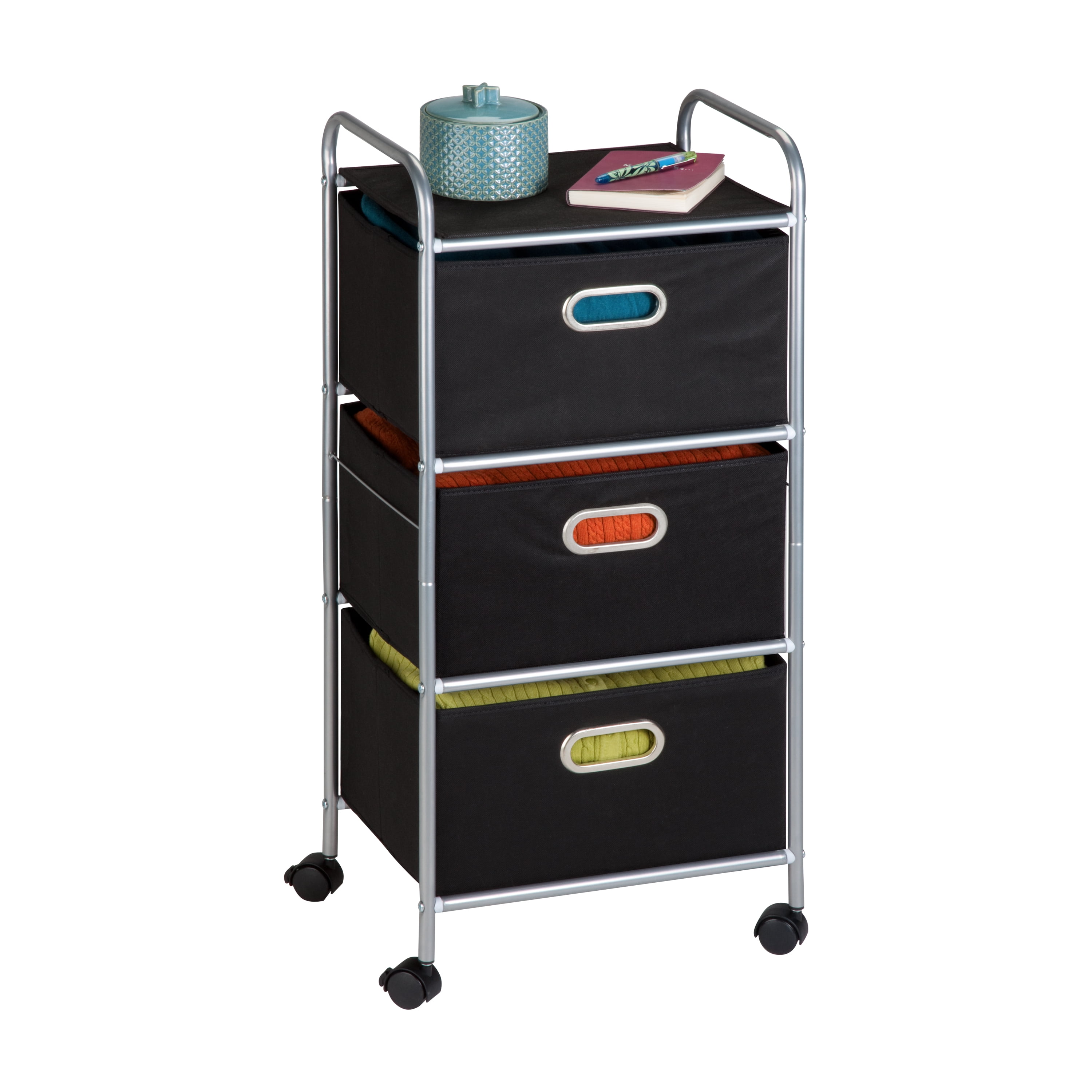 $34.39Getting organized has never looked better with this impressive black fabric cart. The smooth rolling storage unit has three spacious drawers to hold clothes, tools, or anything else you need tucked away. A soft top surface provides even more storage space, and can double as a night-stand. Two locking wheels keep the cart securely in place as needed, and unlock for easy maneuvering around the room.