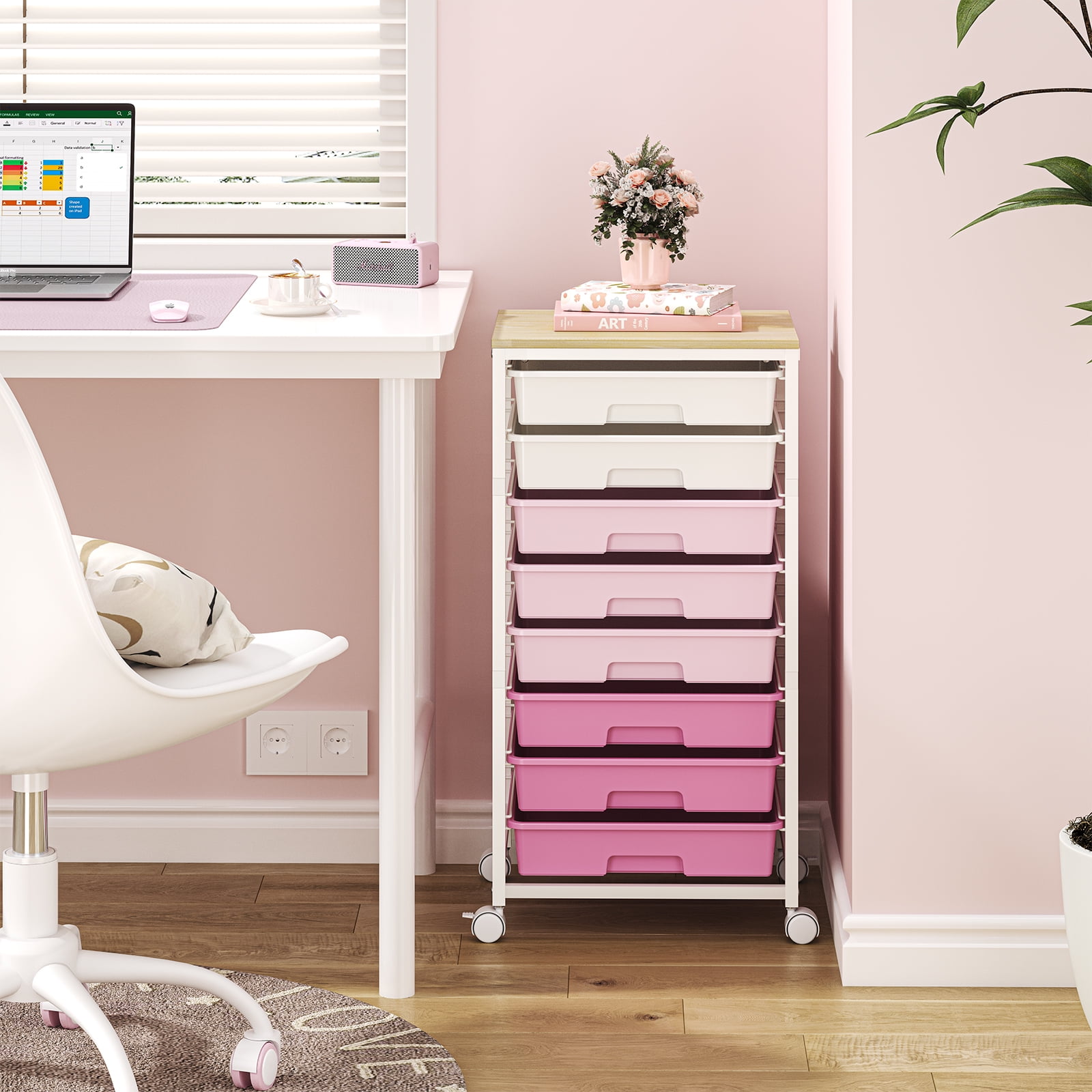 KK KINGRACK Storage Rolling Cart with 8 Drawers, Wooden Tabletop, Metal & Plastic, Pink