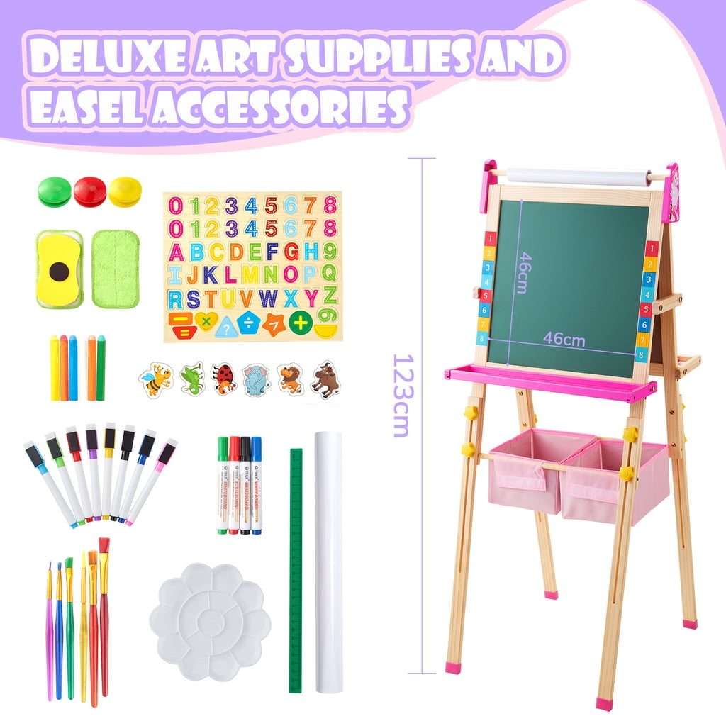 $77.39Original price was: $77.39.$51.59Current price is: $51.59.🦄【Unicorn 𝟯-in-𝟭 Art Easel】 The Keenstone kids painting easel set features a magnetic chalkboard easel for kids on one side, a kid’s magnetic white board on the other side, & a refillable paper roll for painting & drawing.The high-end 3-in-1 kid’s easel is made of natural pine wood. With an 17-inch paper roll attached at the top. 🧲【MAGNETIC EASEL】 Both sides of the easel are magnetic, adding yet another fun way to play! The tray beneath the drawing board is specially designed for convenient storage & rigidity. 💏【CHILD-FRIENDLY DESIGN】 Child’s easel features a sturdy wooden frame, is easy to assemble. It is more stable with non-slip foot rubber cover and triangular vertical easel design. The edges of the easel were all polished and the inverted corners were also rounded to avoid abrasion and bumps, caring with the growth of children. 💭【ADJUSTABLE HEIGHT 】 The legs are easily height adjustable, from 32″ to 52″, making it the perfect standing easel for children of all ages, from a toddler easel to a 13-year-olds easel. ✏️【Versatile and Multi-Purpose】 This children’s art easel can be used for various activities like drawing, painting, and practicing handwriting, making it a perfect tool for creative play and educational development. It’s also a magnetic drawing board for kids, which provides endless fun and educational opportunities. Whether in the classroom or at home, our easel is perfect for a range of activities that your child will love! 🎁【BEST CHOICE EASEL SET】 The chalkboard easel suitable for homeschooling, school enlightenment, training class, parent-child activity. A perfect art toys gift for Birthday, Christmas, Children’s day gift. 💥【ACCESSORIES BUNDLE】 This kids art easel includes a huge 𝟭𝟬𝟬+ pcs: Apron, Paints & Pots, Brushes, Chalk, Markers, Eraser & Cloth, Ruler, Paper Roll, & Magnetic Nos., Letters & Animals.
