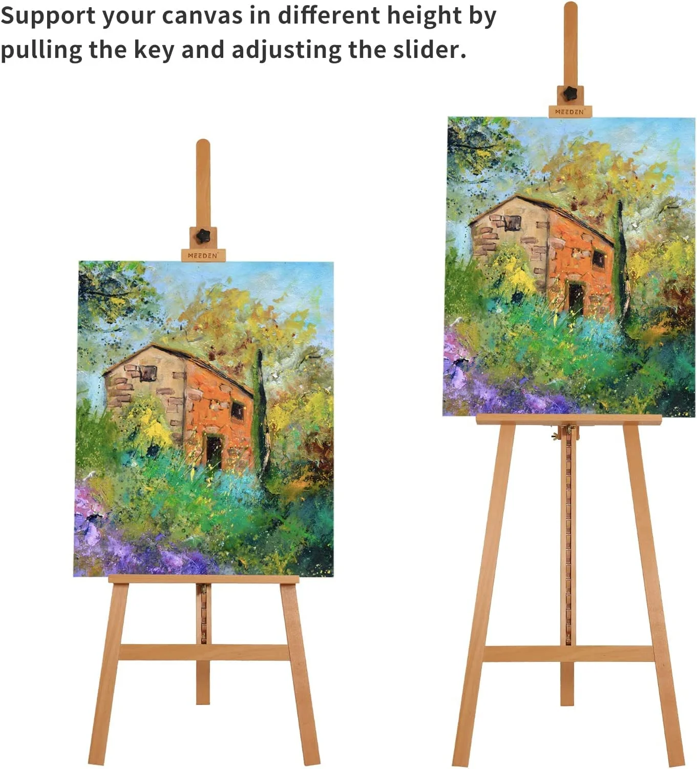 $60.16PAINT FROM ANY PERSPECTIVE: This art display easel is height adjustable,you can use the slider to make different position for displaying or painting,the height can be adjusted from 57-76inches.Meanwhile djusting the rear leg to meet 0-45°angles needs. KEEPS YOUR INSPIRATION FLOWING: This artist adjustable easel makes a perfect studio easel for your larger pieces of work,holding canvas size max in 43inches.European solid beech wood with delicate polished effet bring your inspiration for higher quality work and improved artistic level. HIGH QUALITY AND STABILITY: This floor easel has sturdy A frame construction, eco-friendly, giving it longevity and stability.Overall length in 22.4 inches and Depth in 25 inches.It has a pencile ledge 19 inches in length and 2 inches in width,enough space for large canvas and painting accessories. EASY ASSEMBLY: MEEDEN A frame display easel comes with a detailed instruction brochure and assembling video attched in our listing for how to easily assemble your new easel. All assembly tools are packed well in the package. MEEDEN for ULTIMATE SATISFACTION: MEEDEN is more like a family with hundreds of members wholly dedicated to helping you succeed in your artistic endeavors through high-quality, unique art supplies. And like a family, we stick together, and if anything goes south, you can always rely on MEEDEN, through thick and thin – give us a little sign – a mail, a call, or a message.