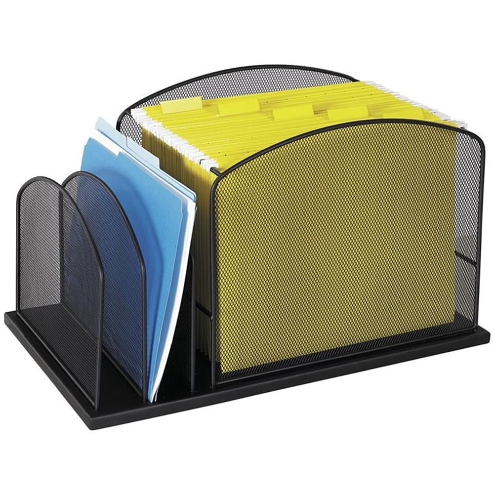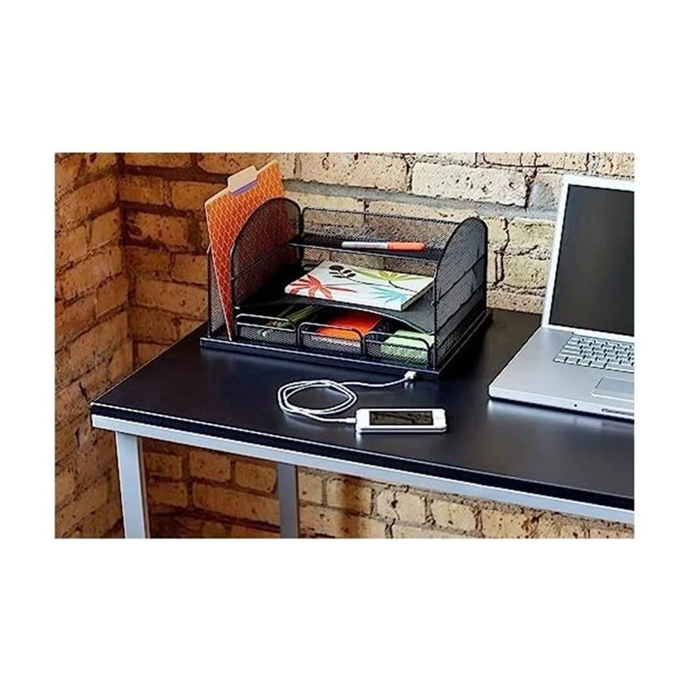 $62.99Onyx it. Organize your office with Onyx desktop organizer. One vertical section for files or folders, plus one horizontal tray for letter-size documents. For smaller items, easily organize them with three accessible drawers below the horizontal tray. There is also a smaller shelf to keep most often used items handy. Easily accessible storage that keeps your work in view will help you multi-task and stay on top of your game. Steel mesh construction with durable powder coat finish.