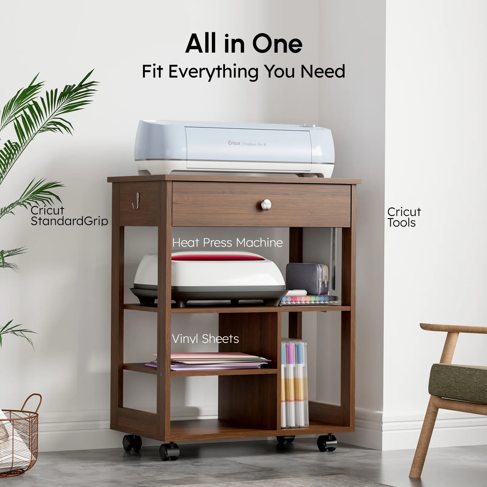 $94.59Description: Mobile Craft Workstation: This cart is a perfect rolling craft station to keep everything within reach! It rolls on four universal wheels, two with brakes, easy to move back and forth between rooms or lock into place without fuss. You can easily pull it away from the wall or have it tucked away when not in use, effortlessly wheeling it to wherever you want it to be. Diverse Storage Spaces: Set up your machine on the top shelf, and organize tools and supplies in the drawer, with the middle shelf sitting for spare machines and the bottom two shelves for vinyl sheets or cardstock papers. The lower vinyl roll holder and side hanging vinyl roll organizer hold up to 23 vinyl rolls. The other side with a hook provides extra hanging space for cutting mats. Solid Construction: The whole is made of premium MDF, and the lower vinyl roll storage rack is made of durable acrylic, with a water-resistant treated surface, easy to clean and maintain. The well-built structure and high-quality materials ensure a high load-bearing capacity of up to 110 lbs, and it moves firmly without wobbling even when fully loaded. Assembly required. Dimensions & Compatibility: Overall dimensions – L 23.6″ x D14.2″ x H 29.5″, the middle shelf – L 21.3″ x D 13.4″ x H 9.15″, the bottom two shelves – L 12.6″ x D 13.4″ x H 5.9″, the vinyl rack hole diameter – 1.97″. The top and middle shelves are compatible with all Cricut machines like Cricut Maker, Cricut Maker 3, Cricut Explore Air 2, Cricut Explore 3, Cricut Joy, Cricut EasyPress Mini, Cricut EasyPress 2, etc. Versatile Usage: Not only for craft machines but also works for sewing machines or printers. You can sort all craft projects in separate compartments and free up counter space, keeping your craft room tidy and clean, perfect space solution for crafters, craft lovers, crafter beginners, and sewers with lots of supplies to store, and great gifts for their/him, families, friends during birthday, holiday, wedding, anniversary.