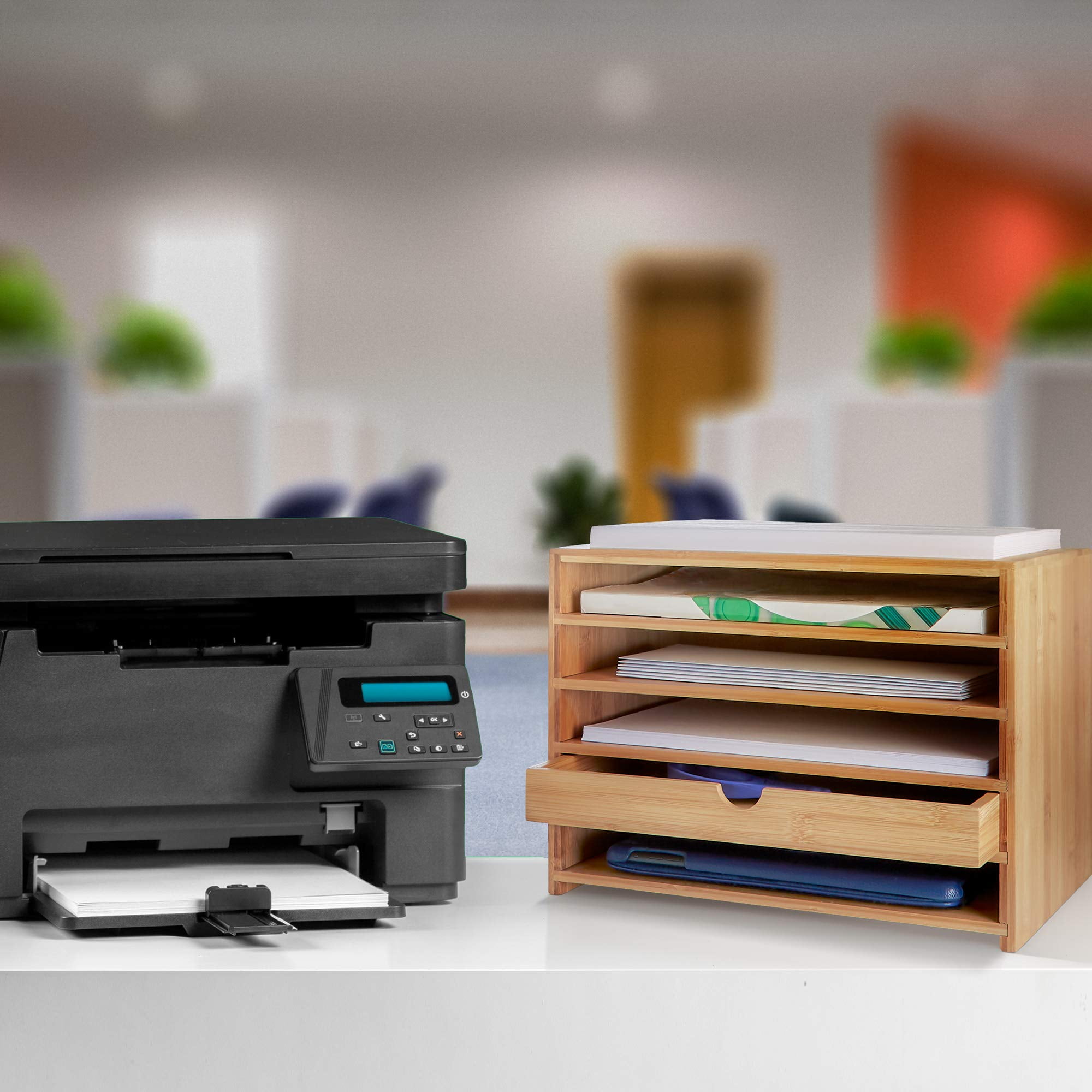 $60.19With this sturdy and stylish paper tray and stationary organizer from Prosumer’s Choice, you can swiftly declutter your desk, kitchen, and home office. Stay stocked with the exact paper you need, especially when your next report, school paper, or grocery list needs to be ready by yesterday. While offering efficient vertical space for all your paper storage needs, it maintains a compact footprint. Keep old printouts, letter mail, or stacks of 8.5 x 11-inch printer paper or use it to hold large and equally sized items like notepads, legal documents, manuals, and books, ensuring they are always within reach. The included pull-out drawer can hold easily misplaced accessories for your printers such as inkjet cartridges, staples for attaching pages, yellow stick-it notes, highlighters for emphasizing key points, or other writing utensils for annotating pages. This organizing solution from Prosumer’s Choice is crafted from natural bamboo, certain to complement any decor from rustic to modern. Bamboo is valued for being harder than hardwood while boasting more tensile strength than steel in addition to being naturally durable and easy to clean. With plenty of features and no assembly needed, this tabletop assistant will bring functionality to any cluttered workspace or countertop.