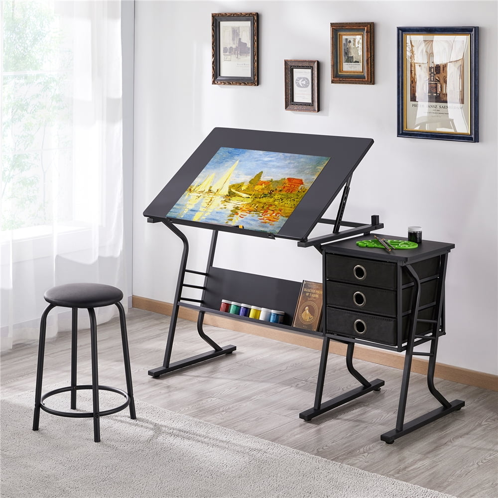 Renwick Adjustable Drafting Table with Storage Drawers and Stool, Black