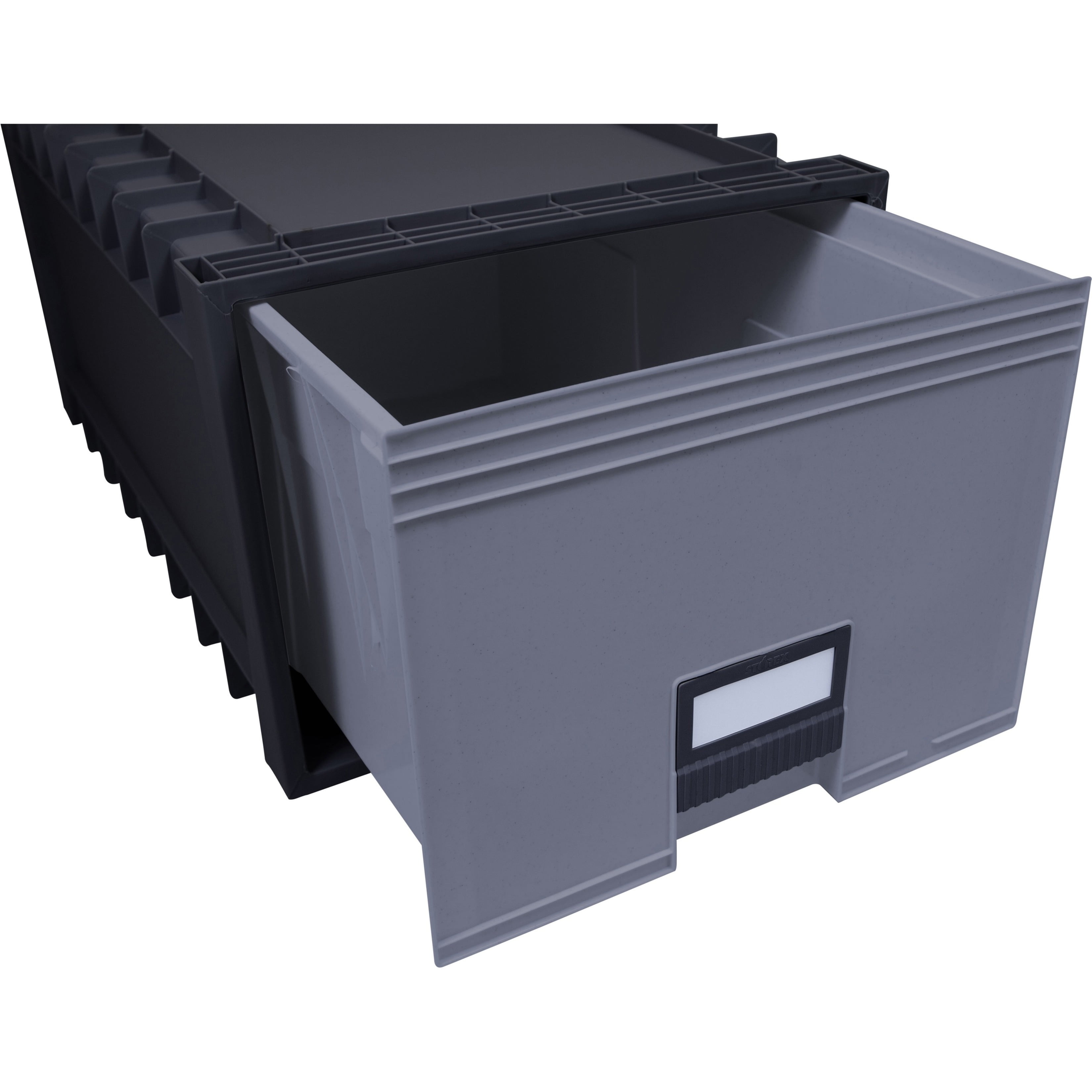 $43.89Secure reports, documents and valuables with this gray and black Storex locking storage drawer. Customize a storage cabinet with this lockable drawer. It can be stacked 10 high. The rugged, durable polypropylene construction resists rust, dents, cracks, and scratches, and it’s waterproof, so important files are protected from moisture. This Storex storage drawer has a reinforced handle for easy access and includes a built-in label holder. • Stackable storage drawer provides extra storage space. • Comes in black/gray and made of poly. • Dimensions: 11.38″H x 18″W x 24″D. • Stacks 10 units high to maximize floor space. • This version is lockable to keep your private documents safe and secure. Maximize Storage Stackable and water-resistant, the Archive Drawer is a great alternative to cardboard boxes to keep your contents dry and easily accessible. The sleek black and grey colors match everywhere from office to garage. Drawers have built-in wheels for easy opening and closing. The built-in label holder and reinforced handle make finding and grabbing the right item quick and easy. Stackable Design Included with each drawer are connectors to stack them up to 10 units high. The drawers are made from a minimum of 25% post-consumer recycled materials for a more sustainable product. • Sold as 1 Each.