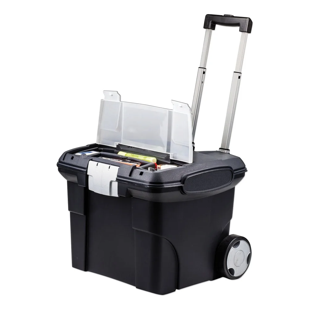 $67.72Original price was: $67.72.$55.37Current price is: $55.37.Durable plastic and steel cart transports letter size files. Snap lid includes built-in organizer compartment for convenient access to supplies. Telescoping push button handle and rubberized wheels for easy mobility. Color: Black; Color Family: Black; Capacity (Weight): 45 lbs; Caster/Glide/Wheel: Wheels.