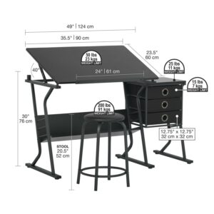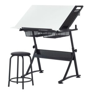 Studio Designs Fusion Craft Center Drafting Drawing Craft Table with Storage and Stool Set, Black/ White