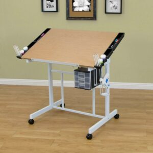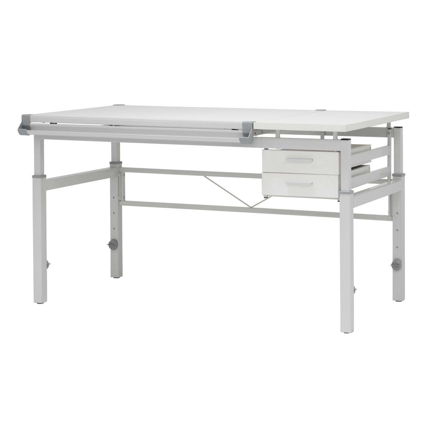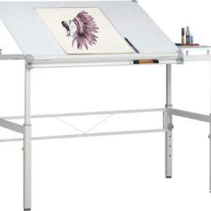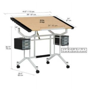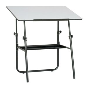$310.39Graphix II Pro Line by Studio Designs Split Top Height Adjustable Drafting Desk is built for multitasking. The dual top surface creates space for drawing on an angle adjustable top while the side top provides room for a laptop or supplies. The durable, heavy-gauge steel construction is built to last. Adjust the height of the table to fit your needs. The workstation features an angled top, flat top, and pencil tray. The 1″ thick melamine tops are durable and easy to clean. The two storage drawers can hold paper and art supplies and keep your work space organized.