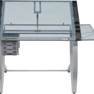 Studio Designs Glass Drafting Table with Adjustable Top and Folding Shelf, Modern Metal