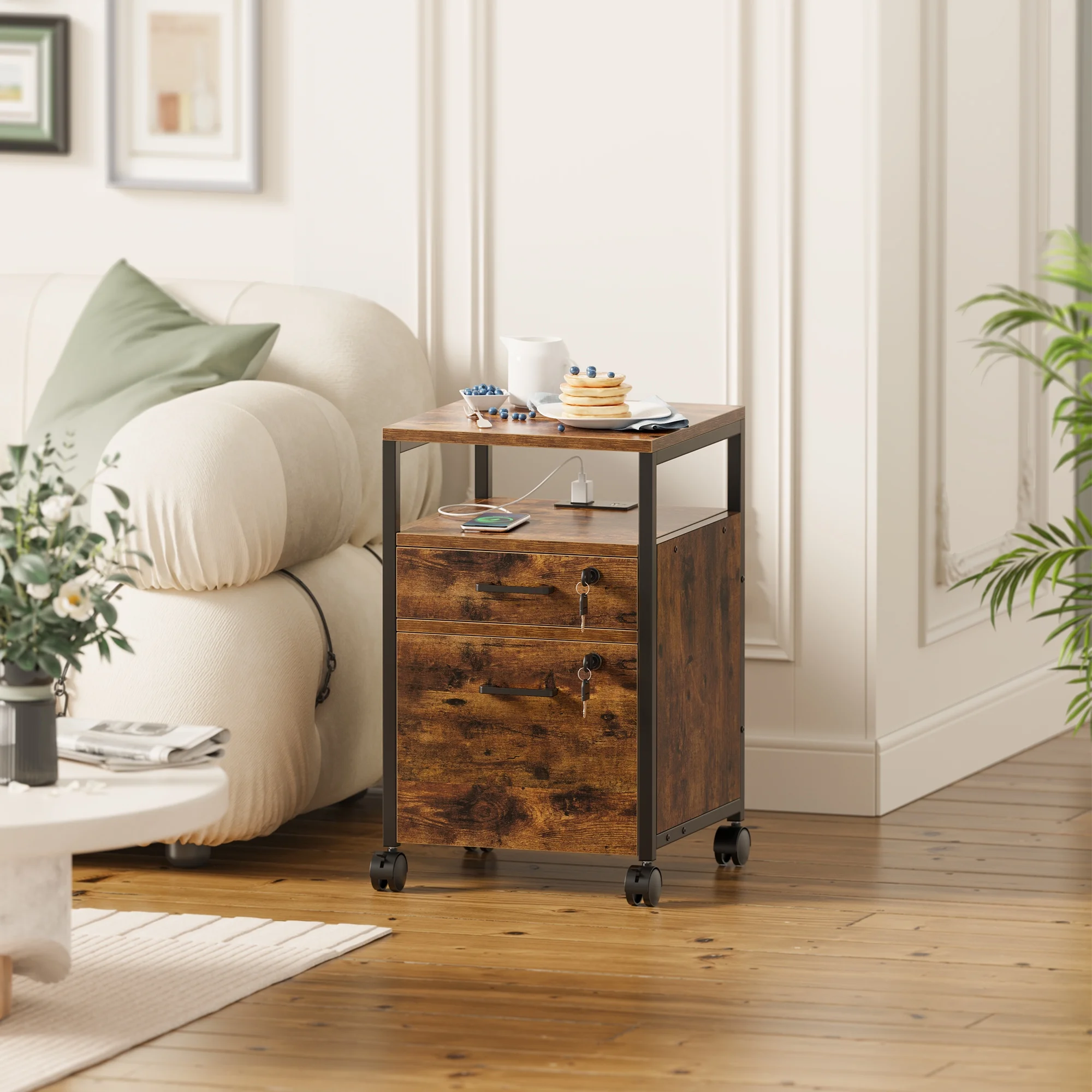 SUPERJARE File Cabinet with Lock & Charging Station, Mobile File Cabinet with 2 Drawers, Rolling Filing Cabinet with Wheels, Office File Cabinet, A4/Letter Size Files Under Desk, Rustic Brown