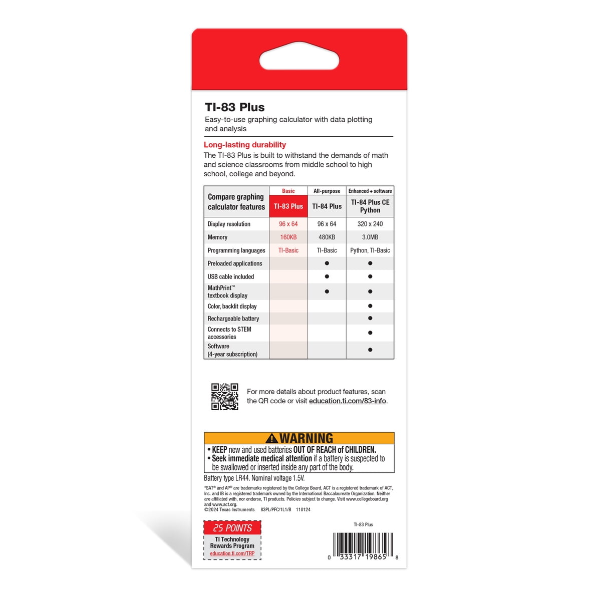 $94.59Original price was: $94.59.$62.77Current price is: $62.77.The TI-83 Plus is an easy-to-use basic graphing calculator that features a high-contrast gray scale display. Math and Science functionality lets students graph and compare functions, as well as perform data plotting and analysis. Ideal for middle school through college. The TI-83 Plus is approved for use on the following exams: SAT®, ACT®, PSAT/NMSQT®, AP®, IB® Diploma Programme.