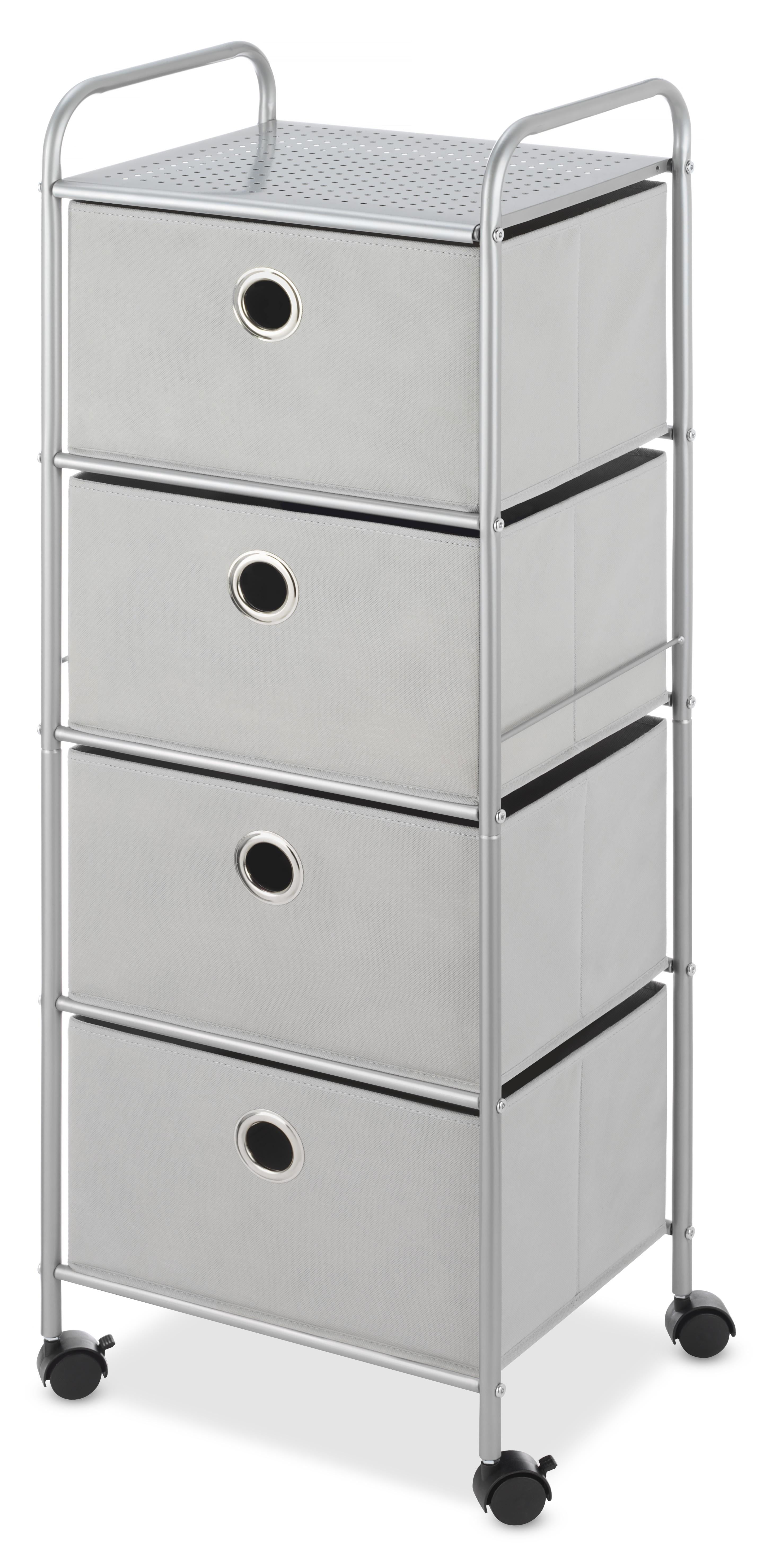 $49.88This four-drawer cart is the perfect small-space storage solution for dorm rooms or apartments. With a silver epoxy-coated metal frame and durable polyester, this item can store access clothing or household essentials and keep your room organized. Featuring fabric drawers and an easy no-tool assembly and heavy-duty wheels, this is an ideal product for college students. The easy-to-clean polypropylene drawers boast fashionable metal grommets which act as drawer pulls. A great space-saving storage unit for a home, office, or dorm room. Adult Use. Whitmor is a 4th generation family-owned and operated business. Since 1946, Whitmor has been dedicated to bringing organization home by creating products that simplify everyday life. Ensuring that those products are built with integrity, value, and innovation is our commitment to you. And our promise is that we will always be here for you should you ever need us as we stand behind our product 100%. Whitmor customer service is available in English and Spanish Monday through Friday from 8 am – 4:30 pm CST. Call us and we will gladly assist you in your language. You may contact Whitmor toll-free at 1-888-944-8667 or via email at [email protected]. Adult
