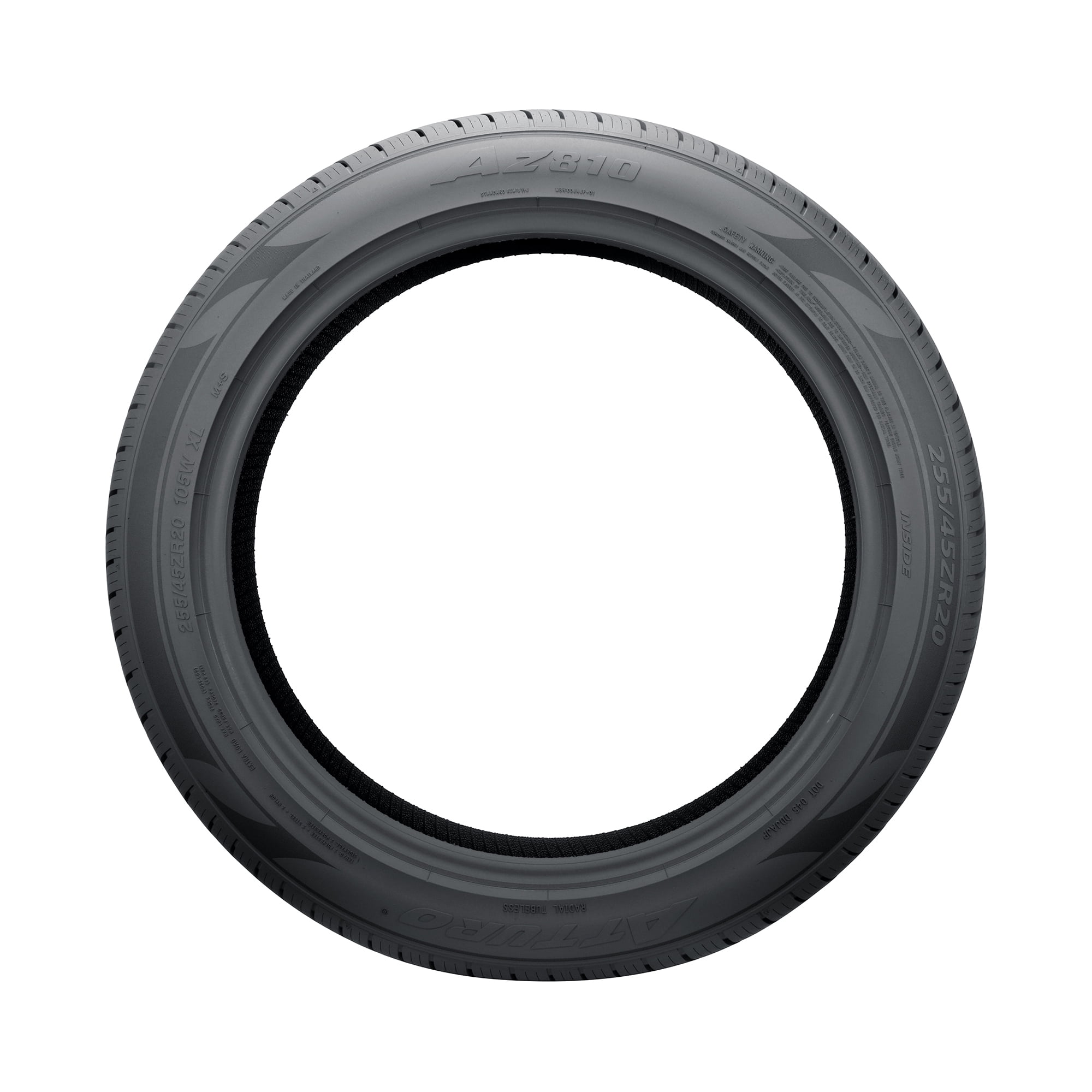 $64.49Atturo AZ810 OVERVIEW The Atturo AZ810 is a performance and high performance, all weather tire made for passenger vehicles and SUVs. Atturo offers a 45,000 mile treadwear warranty with this model. This model is designed for electric vehicles. Great controllability is improved with this tread design. The asymmetric tread design and the special silica compound work together to maintain continuous contact with the driving surface. As a result, the tire is able to effectively upgrade steering responsiveness and driving stability. This allows the tire to enhance steering responses and accuracy, while the structure is secured against driving pressure. The shoulder block pattern provides additional biting edges, upgrading cornering. The angled grooves create friction when braking, significantly shortening its overall braking distance. Great all weather grip is promoted with this model. The ideal tread design and the durable all weather compound enhance dry, wet, and winter-weather road grip. The optimized siping pattern and the ideally placed tread elements increase road grip with additional biting edges. The compound keeps its rubber flexible in various temperatures. As a result, the tire remains pliable from the heat of summer to colder winter conditions. Circumferential and angled lateral grooves prevent hydroplaning. They disperse water and slush from the footprint. The model provides excellent high speed durability. The special heat-resistant compound elements and the better structural stability allow the tire to enhance its high speed capability. The reinforced compound elements prevent heat build-up along the tread area, minimizing the pressure affecting the tire. The structure does not allow the tire to deform under driving pressure. This greatly enhances the high speed driving experience. The Atturo AZ810 offers high driving comfort levels. The footprint features a variable pitch pattern, which helps keep road noise low. This pattern generates a special sound frequency while the tires are in motion. As a result, the tire negates sound waves before they can reach the vehicle’s cabin and ruin the passengers’ driving enjoyment. Better comfort provides an enjoyable driving experience. All weather tires receive the three mountain peak and snowflake (3PMS) symbol for their exceptional winter weather performance. They are all season tires with extra winter weather grip, in order to guarantee safer year-round durability. This ensures their true and secure driving ability throughout the year. Manufacturers recommend changing tires every 10 years. As long as tires are properly stored before they are sold, the year of their manufacture will not shorten their service life.