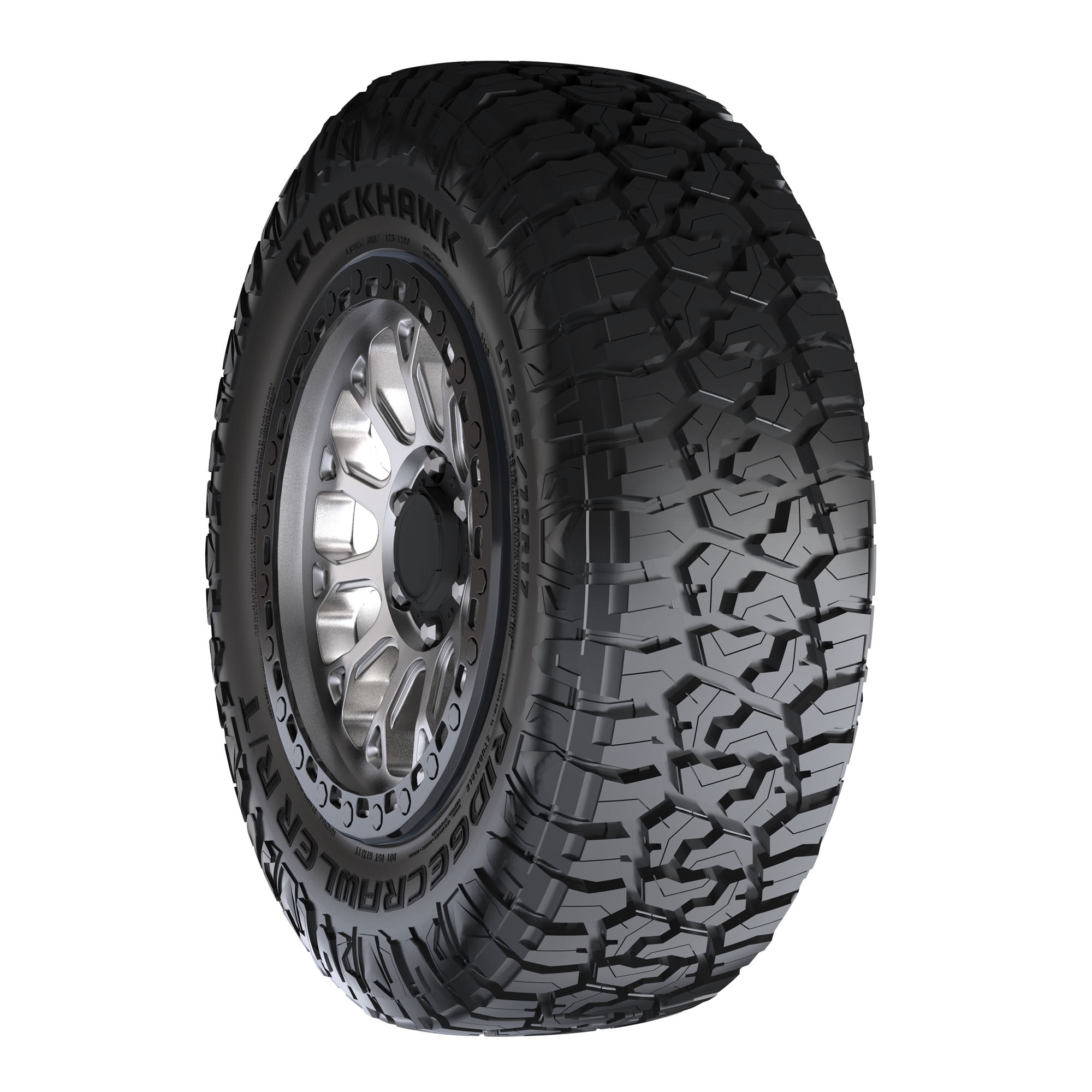 $129.89BlackHawk Ridgecrawler R/T LT265/70R17 123/120Q E OVERVIEW Blackhawk’s Ridgecrawler R/T is a rugged terrain tire designed for light trucks and SUVs. It features a tough, damage-resistant tread compound and aggressive block tread with a dense network of sipes, making it suitable for severe winter conditions and earning it the Three Peak Mountain Snowflake certification. The tire’s shoulder lugs extend onto the sidewall to provide lateral traction. Additionally, the Ridgecrawler R/T comes with a 60,000 mile limited manufacturer’s tread life warranty (45,000 miles for LT sizes).
