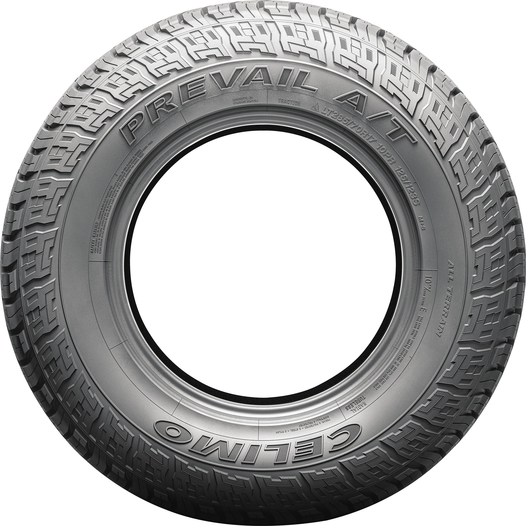 $142.31Celimo Prevail A/T 285/70R17 117T OVERVIEW Loaded with innovations and performance-oriented features, the Celimo Prevail A/T is an outstanding all-terrain tire for light trucks, Jeeps, and SUVs. The Prevail A/T is designed for durability and off-road traction, with offset tread blocks and step-down groove walls that improve durability and handling while also helping to eject stones and debris to protect the casing. The Celimo Prevail A/T’s lugs at the shoulder extend down onto the sidewall for enhanced lateral traction, and It’s variable-depth siping earns it the Three Peak Mountain Snowflake certification for severe winter service. Additionally, the Celimo Prevail A/T is covered from the factory with a 50,000 mile limited manufacturer tread life warranty.