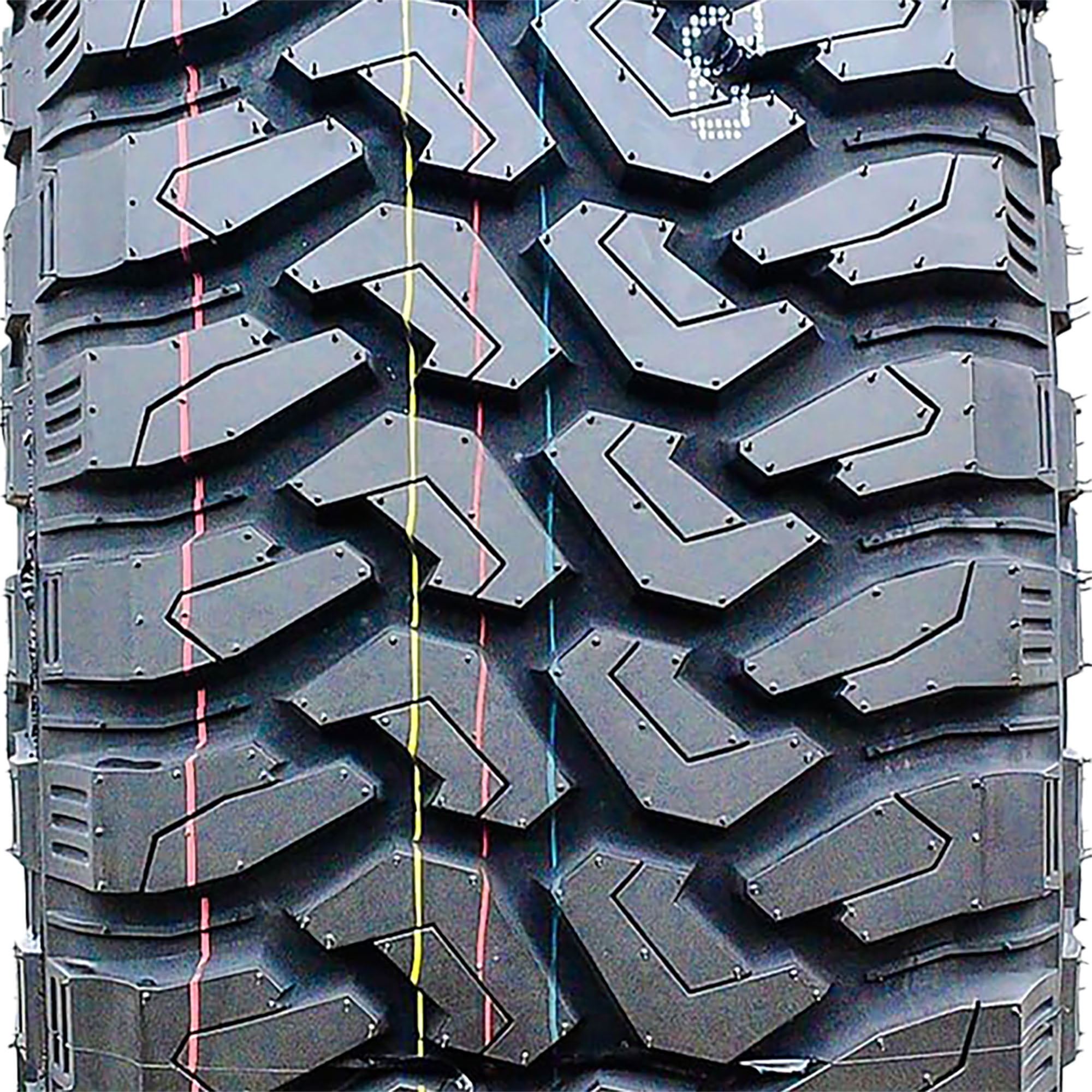 $306.98The Centennial Dirt Commander MT tire is an off-road mud tire that provides the ultimate levels of mud traction, and grip on rock and mixed terrain. It has an aggressive tread pattern and raised upper shoulder sidewall lugs that Jeep and truck enthusiasts love. While the tire is designed primarily for off-road traction, it is remarkably quiet on the highway, so a great option for mall-crawlers or any daily driver in the city. For off-road traction, the voids between the massive center blocks, as well as the wide open shoulder grooves help evacuate mud and debris from between the treads. The upper shoulder lugs not only look cool, they work to add extra biting edges in deep loose mud, sand and snow, as well as providing extra protection from sidewall impacts.
