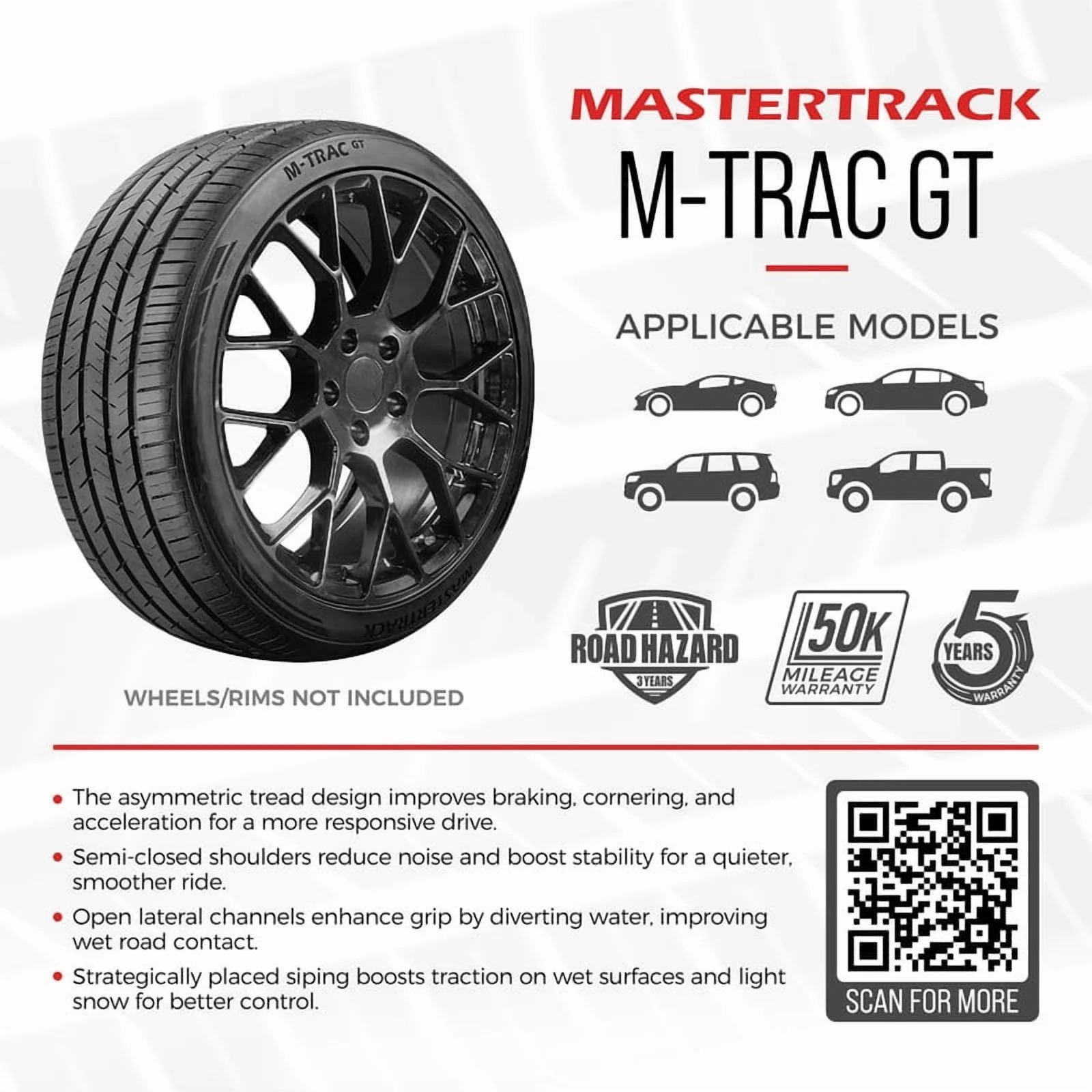 $78.70Attention! Due to the size of the tires, Packages might be SEPARATED in the courier facility and not be DELIVERED on the SAME DAY, even though we do ship them together. Tracking information can be checked on the couriers website with the master tracking number you will receive via email. For example: You can receive 3 tires in one day and the 4th one the next day or the day after, or one tire in one day and the second one day after. Mastertrack M-TRAC HP Performance 235/45ZR18 94W High Performance All Season Passenger Tire 235/45/18 235/45/R18(Tire Only) Features And Benefits Road Hazard Warranty Manufacturer Tread Wear Out Warranty Excellent all weather traction Longer lasting tread life Low road noise Superb high-speed stability OVERVIEW The Mastertrack M-TRAC HP Tire is a performance and high performance, depending on the speed rating of the specific tire size, all season tire constructed for passenger vehicles. Even at high speed, this model does not lose its directional stability. It maintains its shape at any speed and does not deform under pressure. Addition, our tire product comes with a Road Hazard Warranty, and here’s how it benefits you: This warranty provides you with protection against unforeseen road circumstances such as punctures, cuts, or other damages. If your tire gets damaged due to road conditions while driving, our warranty offers support and assistance without any additional expenses on your part.Purchasing our tire product grants you this reassuring Road Hazard Warranty, adding an extra layer of safety to your driving experience!