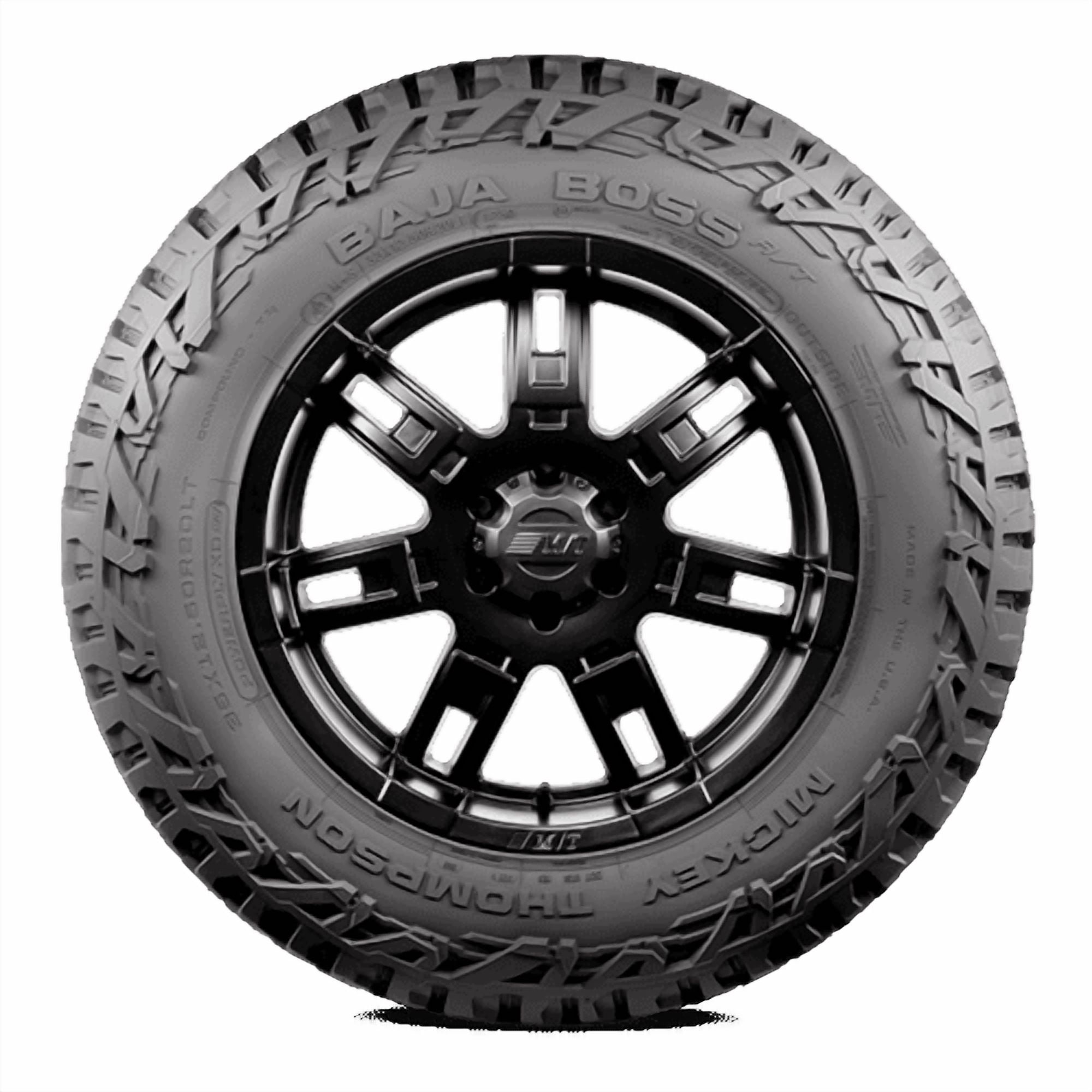 $324.89The Mickey Thompson Baja Boss A/T is the ultimate rugged all-terrain tire, delivering top-tier performance on and off the road. This tire is engineered for drivers who need confident off-road traction without sacrificing comfort on pavement. It is ideal for trucks and SUVs that see both highway and trail use. Engineered for SUVs, light trucks, and Jeeps, this aggressive yet refined tire features an asymmetrical tread design for superior handling, reduced road noise, and exceptional all-weather traction. Its silica-reinforced compound enhances wet grip, braking performance, and resistance to cuts and chips, while the PowerPly XD construction provides added puncture resistance, improved handling, and quicker steering response. For off-road enthusiasts, the Baja Boss A/T boasts 150% deeper Extreme Sidebiters® than the Baja ATZ P3, offering maximum traction, sidewall protection, and a bold, rugged appearance. It’s severe snow service rated (3PMS symbol) in sizes 12.50 (315) and narrower, ensuring reliable winter performance. With a 50,000-mile limited treadwear warranty (LT-metric sizes) or 60,000 miles (select sizes), this tire is built to last, making it a versatile and durable choice for those who demand superior all-terrain capability. This tire also delivers a composed ride on the highway. Noise-reduction patterns help maintain road comfort, while the reinforced sidewall construction adds durability and confidence under load or while towing. Best-suited for: Trucks, off-road SUVs, lifted crossovers, and light-duty trail use. Tire Best Features: Deep tread blocks and open shoulders provide off-road bite. Stone ejectors prevent debris retention and enhance durability Reinforced sidewalls protect against cuts and impacts On-road tread design reduces noise for pavement use All-terrain capability for mud, dirt, and uneven surfaces