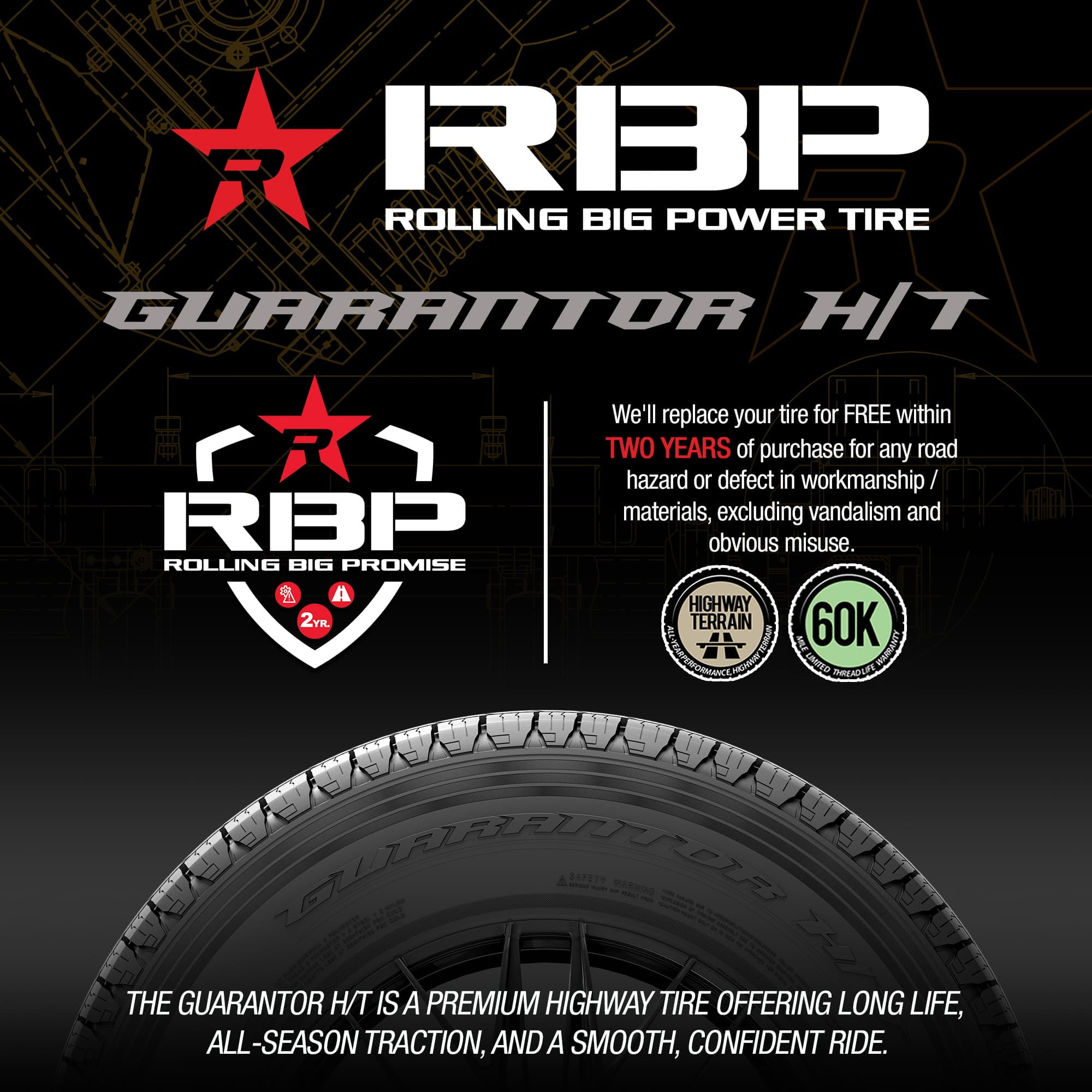 $168.88RBP Guarantor H/T OVERVIEW The RBP Guarantor H/T is a highway terrain, all season tire made for light trucks and SUVs. This model has some touring, passenger sizes available as well. RBP offers a 60,000 mile treadwear warranty with this model. The continuous center rib’s surface contact effectively improves the controllability. The symmetric footprint ensures consistent road contact. As a result, this helps the tire boost steering responsiveness and driving stability. Quick and precise steering responses are guaranteed, while the structure is also secured against driving pressure. The cornering is upgraded with the biting edges that firmly grip the road. The sipe pattern creates friction, which significantly shortens the tire’s braking distance. The tire promotes great all weather traction. The tire provides great traction in dry, wet, and light winter conditions. This is achieved with the tread design and the durable compound. They work together to generate traction with extra biting edges and to keep the tire pliable throughout the year. Hydroplaning is resisted with the tread design that disperses water and slush from the footprint, further enhancing its performance on wet roads. Great load and driving durability are ensured with the tire’s reinforced internal structure. Tires can deform under load pressure if their construction is not strong enough. Therefore, by reinforcing the sidewalls of this tire, it is able to securely handle larger loads. Great load capacity is ensured as the tire manages to increase its ability to carry and withstand such loads. The RBP Guarantor H/T manages to offer high driving comfort levels throughout the performance. This stabilized footprint guarantees a noise-free and comfortable driving experience. These tread elements are able to prevent airwaves from generating tread noise, while road vibrations are absorbed with constant road contact. This enables the passengers to enjoy a quiet and comfortable driving experience. Not all tire sizes are suitable for all vehicle types. Please refer to the item specifications for accurate information about vehicle type fitment for this particular size. Manufacturers recommend changing tires every 10 years. As long as tires are properly stored before they are sold, the year of their manufacture will not shorten their service life.