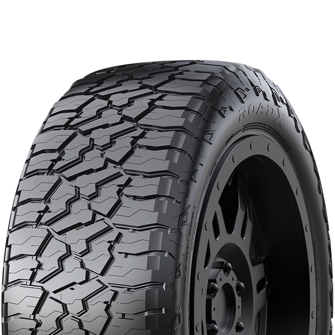 $153.07RoadX Rxquest AT QX12 OVERVIEW The RoadX Rxquest AT QX12 is an all terrain, all weather tire made for light trucks and SUVs. RoadX offers a 50,000 mile treadwear warranty with this model. The aggressive tread pattern and the durable rubber compound enhance the tire’s performance on soft, loose, and uneven terrains. The optimized tread elements firmly grip the surface, with extra biting edges, and keep forward motion at all times. These elements guarantee the tire’s perfect performance both on- and off-road. At the same time, the self-cleaning ability keeps the footprint clean, by dispersing mud, snow, and rocks stuck between the tread elements, ensuring better contact with the driving surface. Also, this self-cleaning nature prevents stone retention from harming the tire’s casing. The model promotes excellent all weather traction. In other words, the aggressive tread pattern maintains close surface contact at all times, while the silica compound maintains flexibility in warm summer and freezing winter temperatures. These elements boost the tire’s dry, wet, and winter-weather performance. The optimized grooves on the tread area effectively eliminate water and slush from the footprint and prevent hydroplaning. Excellent controllability and maneuvering are upgraded with this tire. The aggressive tread pattern and the rubber compound maintain close road and terrain contact at all times. It increases the tire’s steering responsiveness and driving stability. The steering response time becomes faster and more precise to the driver’s commands, while the structure is secured against driving pressure. The wide shoulder blocks and their strong grip boost cornering and maneuvering. The RoadX Rxquest AT QX12 offers a quiet and comfortable driving experience. The ideal tread design reduces road and tread noise levels heard in the vehicle’s cabin. On the other hand, the silica compound absorbs the shock of the ride, which lowers vibrations felt by the passengers. These elements enhance driving comfort levels. All weather tires receive the three mountain peak and snowflake (3PMS) symbol for their exceptional winter weather performance. They are all season tires with extra winter weather grip, in order to guarantee safer year-round durability. This ensures their true and secure driving ability throughout the year. Not all tire sizes are suitable for all vehicle types. Please refer to the item specifications for accurate information about vehicle type fitment for this particular size. Manufacturers recommend changing tires every 10 years. As long as tires are properly stored before they are sold, the year of their manufacture will not shorten their service life.