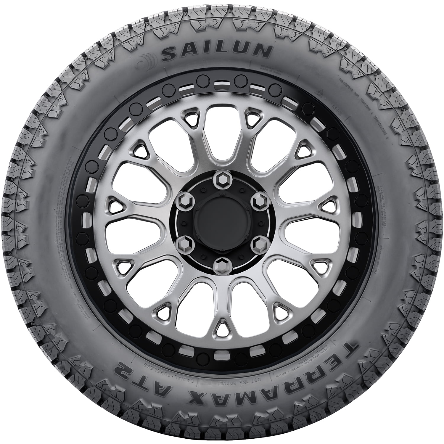 $120.39Sailun TerraMax AT2 OVERVIEW The Sailun TerraMax AT2 is an all terrain, all weather tire made for light trucks and SUVs. Sailun offers a 50,000 mile treadwear warranty with this model. The aggressive tread design also increases the all terrain traction. The aggressive tread design and the durable rubber compound ensure great on-road and soft, loose, and uneven terrain grip. The optimized tread design ensures additional sideway biting edges, increasing its deep mud and loose dirt performance. Additionally, the tread design features mud and stone ejectors that keep the footprint clean. Mud and snow do not block surface contact, while stone retention is effectively prevented. Great handling and maneuvering are ensured with this model. The aggressive tread block placement manages to increase its surface contact. The tire manages to boost its steering responsiveness and driving stability, both on- and off-road. It promotes faster and more precise steering responses, while the structure is secured against driving pressure. The model offers great cornering and maneuvering as well. Cornering and braking are upgraded with the ideal tread elements, guaranteeing the driver’s control over the vehicle at all times. The reinforced internal structure and the durable rubber compound upgrade the model’s load durability and damage resistance. The reinforced internal structure maintains the ideal tire shape under pressure. This improves the tire’s overall load capacity during the performance. The durable rubber compound protects the tire from cuts, tears, and punctures. The special tread design and the rubber compound also upgrade the off-road traction, while offering damage resistance. This ensures external damage protection, increasing the tire’s lifetime. The Sailun TerraMax AT2 promotes great all weather traction. The all weather compound and the ideal tread design boost the dry, wet, and winter grip on the road. The tread’s siping and notch placement firmly grips the road with extra biting edges, while the compound keeps the rubber flexible in versatile temperatures. The groove pattern helps to prevent on-road hydroplaning by eliminating water and slush from the footprint, significantly upgrading the model’s wet-weather driving safety levels. All weather tires receive the three mountain peak and snowflake (3PMS) symbol for their exceptional winter weather performance. They are all season tires with extra winter weather grip, in order to guarantee safer year-round durability. This ensures their true and secure driving ability throughout the year. Not all tire sizes are suitable for all vehicle types. Please refer to the item specifications for accurate information about vehicle type fitment for this particular size. Manufacturers recommend changing tires every 10 years. As long as tires are properly stored before they are sold, the year of their manufacture will not shorten their service life.
