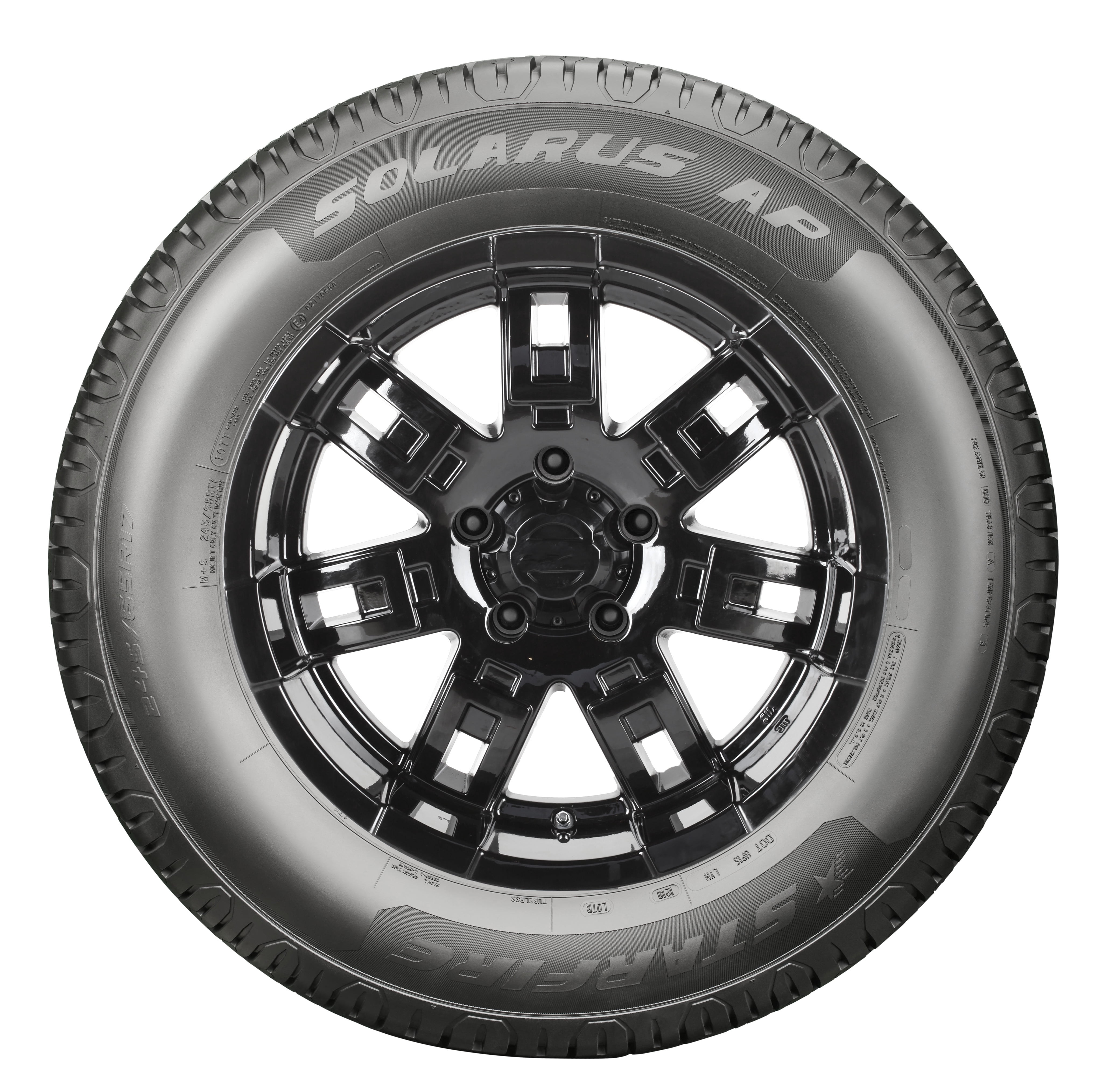 $163.42Starfire Solarus AP The Starfire Solarus AP features an all-purpose tread design with large tread blocks that enhance traction on dirt paths and farmland, while still providing strong on-road performance. Its quiet zig-zag tread pattern disrupts airflow through the tread, which helps reduce noise. For wet conditions, anti-hydroplane grooves expel water from the tire to promote wet traction and resist hydroplaning, while all-season sipes provide additional biting edges to aid in grip. This M+S rated tire is designed for confident all-season performance.