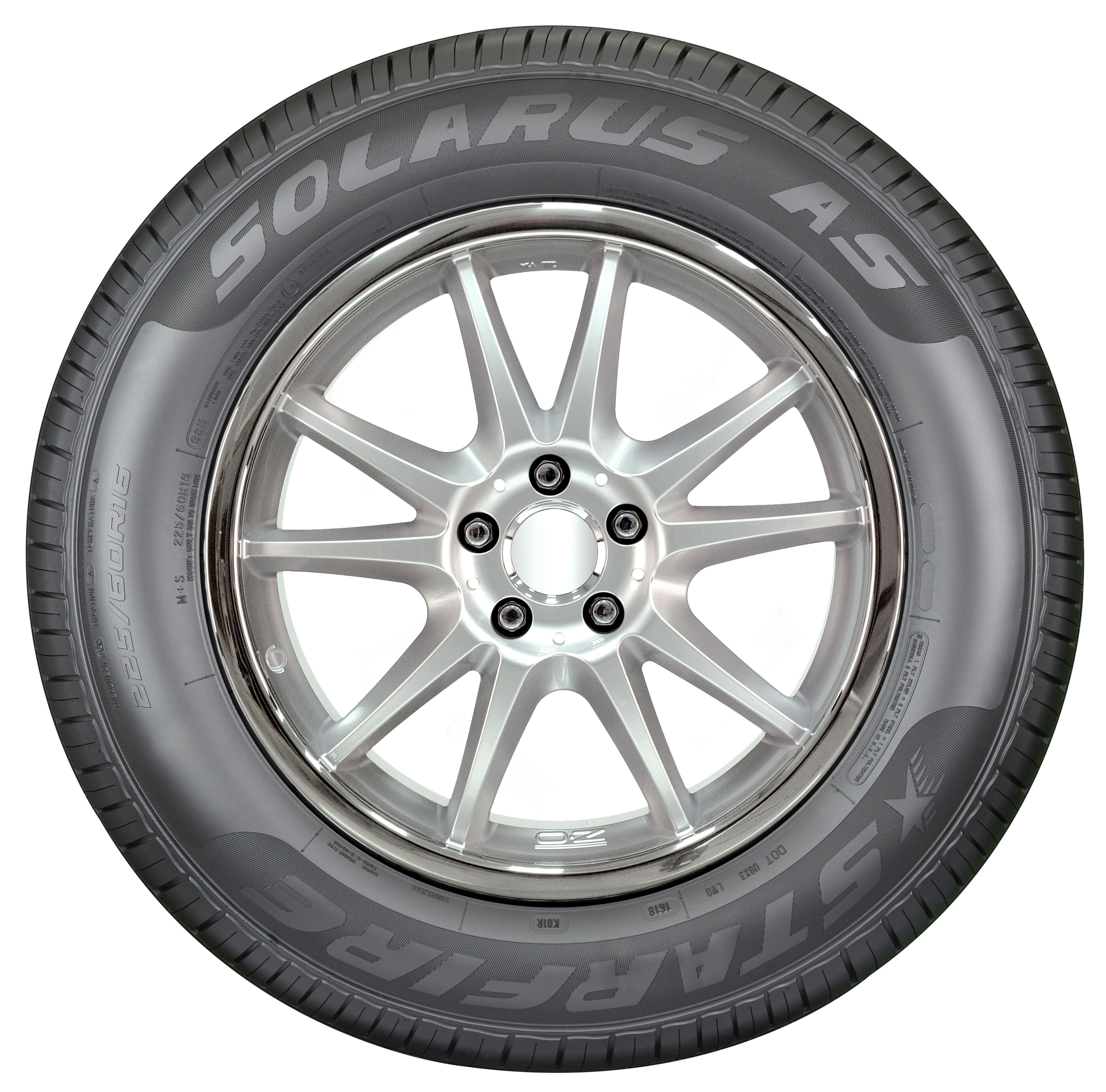$63.64Starfire Solarus AS OVERVIEW The Starfire Solarus AS is a touring all season tire manufactured for passenger vehicles and SUVs. Starfire offers a 50,000 mile treadwear warranty with this model. The tire promotes great all weather traction and road gripping ability. The special all season tire compound and the symmetric mirrored tread design work together to increase the dry, wet and winter weather road grip. The compound manages to maintain its flexibility throughout the year, including in winter weather conditions, while the tread design’s elements find firm grip on the road surface. The tread’s wide circumferential grooves prevent hydroplaning by dispersing water and slush from below the tire’s footprint. The enhanced hydroplaning resistance and exceptional all weather traction guarantee a safer year round performance. The model also provides a quiet and comfortable drive. The tread pattern features a closed shoulder design that prevents road noise from forming while the tires are in motion. The closed shoulders prevent airwaves from entering the tire’s footprint and coming into contact with the tread elements. In this manner, the road and tread pattern noise cannot generate and cannot reach the vehicle’s cabin. The model’s flat footprint enables the tire to closely follow the road surface, which absorbs the shock of driving. As a result, the road vibrations are not felt during the drive by the passengers. The decreased road noise and vibration levels offers an enjoyable driving experience. The tire guarantees a longer lasting tread life. The flat footprint’s constant road contact evenly distributes the driving pressure along the tire’s surface. This equally spread out forces of acceleration, cornering and braking lengthen the tread life and the tire’s usability by preventing irregular tread wear formations across the entire tread area. The longer lasting even tread wear lengthens the tread life and the tire’s usability. The Solarus AS is easily controlled. The tread design keeps the tire’s road contact at all times, which improves the steering responsiveness and driving stability. In other words, the better road contact upgrades the steering accuracy and response time to the driver’s commands, while it stabilizes the tire against the driving pressure affecting it during the drive. This allows the driver to confidently control the vehicle in all weather conditions. Manufacturers recommend changing tires every 10 years. As long as tires are properly stored before they are sold, the year of their manufacture will not shorten their service life.
