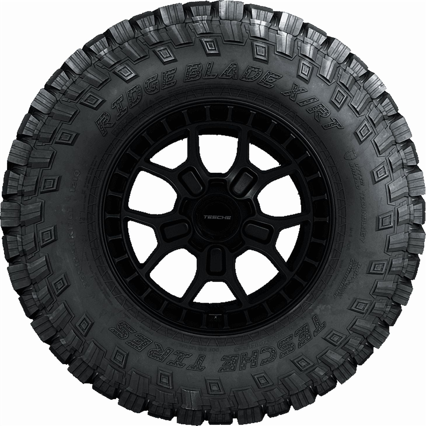 $186.61Tesche Tires Ridge Blade X/MT OVERVIEW The Tesche Tires Ridge Blade X/MT is a mud terrain, all season tire made for light trucks. The model offers excellent performance on mud terrain surfaces. The optimized “Viking Tomahawk” 3D tread pattern firmly grips the surface with extra biting edges and keeps forward motion on deep, muddy surfaces. At the same time, the double stone and mud stripping bars keep the footprint clean during the performance. They eliminate mud, snow, and rocks stuck between the tread elements. This also prevents stone retention from harming the tire’s casing during the off-road ride. The tire’s special design ensures a safe driving experience on muddy terrains. Great driving durability is provided with this model, thanks to the dual sidewall design. One side of the tire features raised black lettering, creating a rugged 3D aesthetic. In contrast, the other side showcases a refined, bold writing in 3D. At the same time, the tire features a reinforced sidewall and the UTTER SHIELD Technology to prevent damage such as cuts in extreme road conditions. This technology is designed to increase the tire’s durability and damage resistance, especially during the off-road performance. The optimized tread pattern and the rubber compound enhance the tire’s overall controllability. The driver has better control over the vehicle throughout the performance. Better surface contact improves the tire’s steering responsiveness and driving stability. This results in better steering responses and accuracy to the driver’s commands, while the structure is secured against driving pressure. Cornering and maneuvering are also improved in this manner. The shoulder blocks provide biting edges to make this happen. The Tesche Tires Ridge Blade X/MT ensures a quiet and comfortable driving experience. The variable pitch design is designed for effective noise reduction. The tire’s design reduces the noise from being heard in the vehicle’s cabin. This means road disturbances do not ruin the passengers’ driving experience. In other words, the tire guarantees a quiet and noise-free performance. The intended purpose of Mud Terrain tire types is off-road use. They are not designed for regular highway driving. Manufacturers recommend changing tires every 10 years. As long as tires are properly stored before they are sold, the year of their manufacture will not shorten their service life.