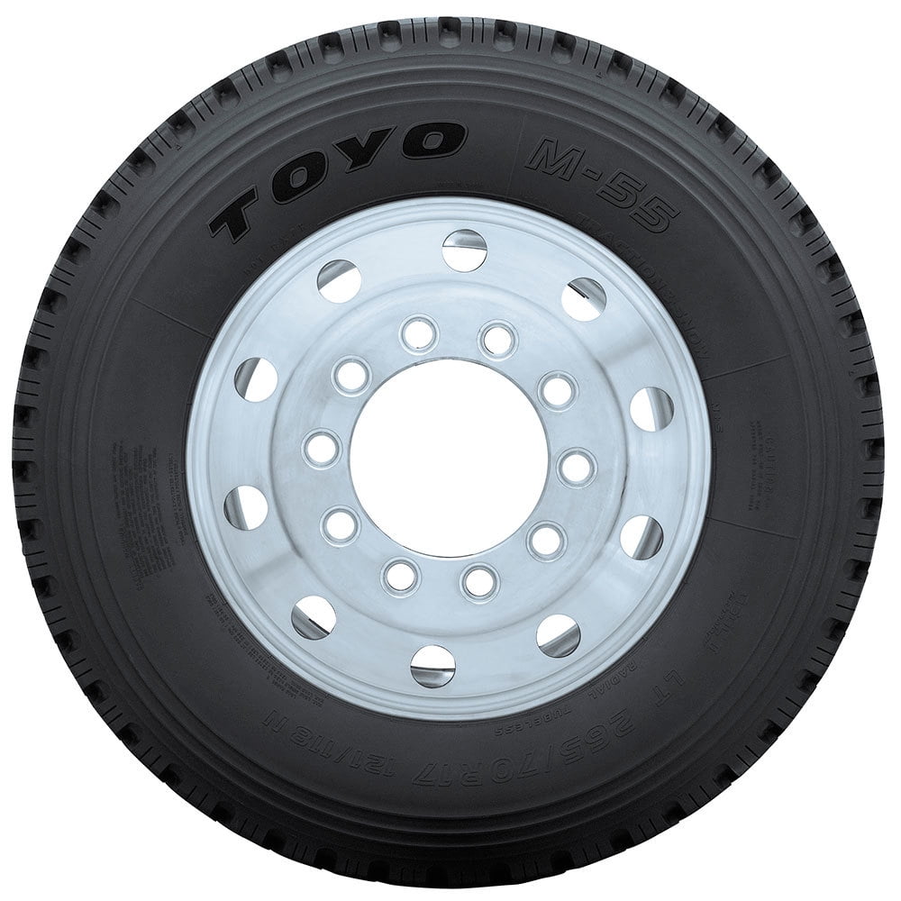 $322.05Toyo M-55 LT265/75R16 123/120Q E OVERVIEW The Toyo M-55 is a commercial all-terrain tire that’s ready to work as hard as you do. The M-55 features an aggressive lug-and-block tread that’s pre-drilled for easy installation of TSMI #15 studs (where permitted) for traction in extreme winter conditions, earning it an M+S rating for winter traction. Additionally, the M-55 boasts a deep 17/32″ tread depth for long wear and a durable tread compound that stands up to hard use for a longer service life.