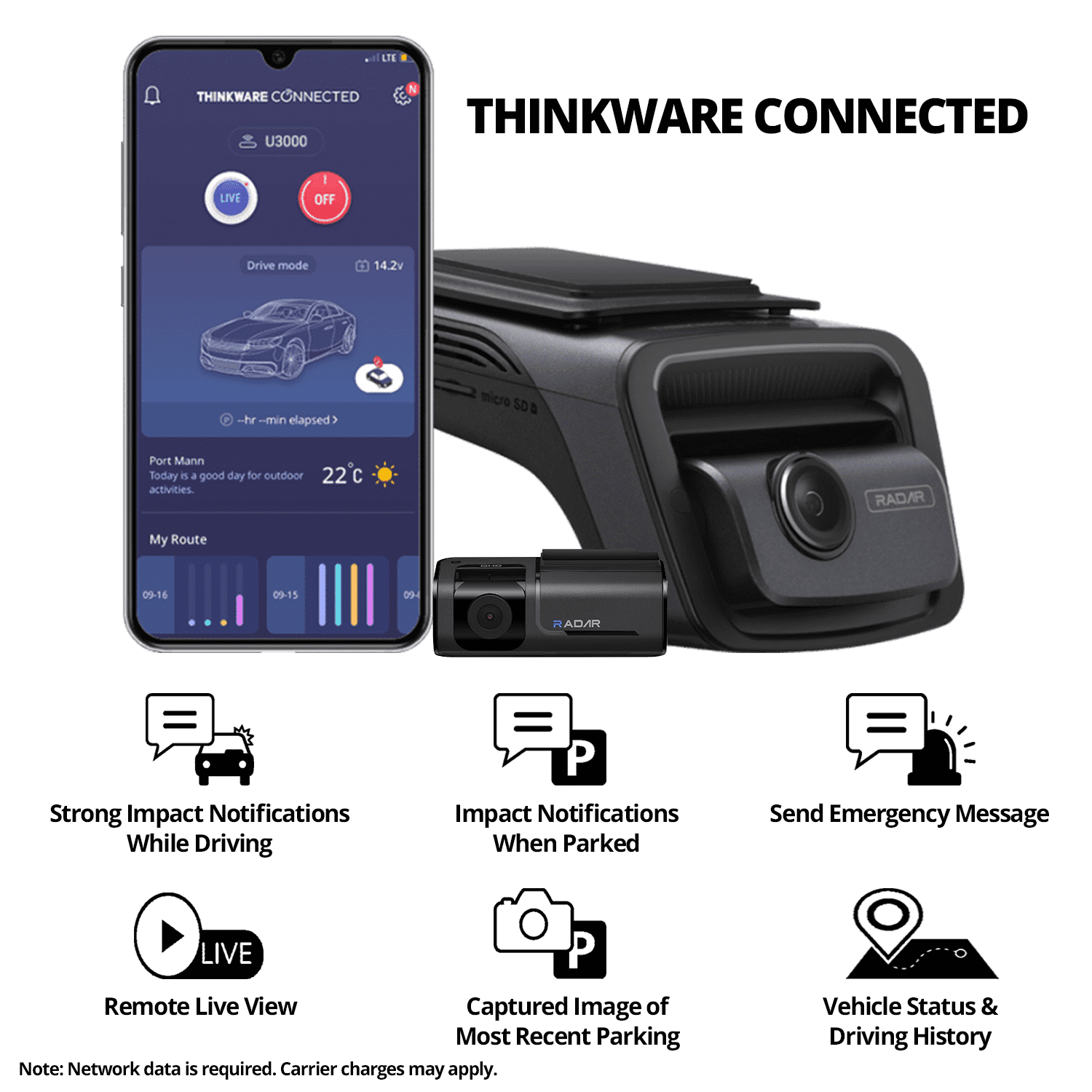$472.99Original price was: $472.99.$395.59Current price is: $395.59.Enjoy unparalleled parking protection with Thinkware’s all-new U3000 dash cam. The built-in radar enables the dash cam to monitor motion and impact with minimal power consumption while in Parking mode, allowing for prolonged surveillance of your parked vehicle. Featuring Sony’s next-generation STARVIS 2 sensor, the U3000 benefits from the latest advancements in recording technology to capture stunning daytime and nighttime footage in 4K UHD. Thanks to the Thinkware Connected companion app, you can keep tabs on your vehicle with features like Remote Live View, Locate Vehicle, and Impact Notification when the U3000 is connected to the internet.