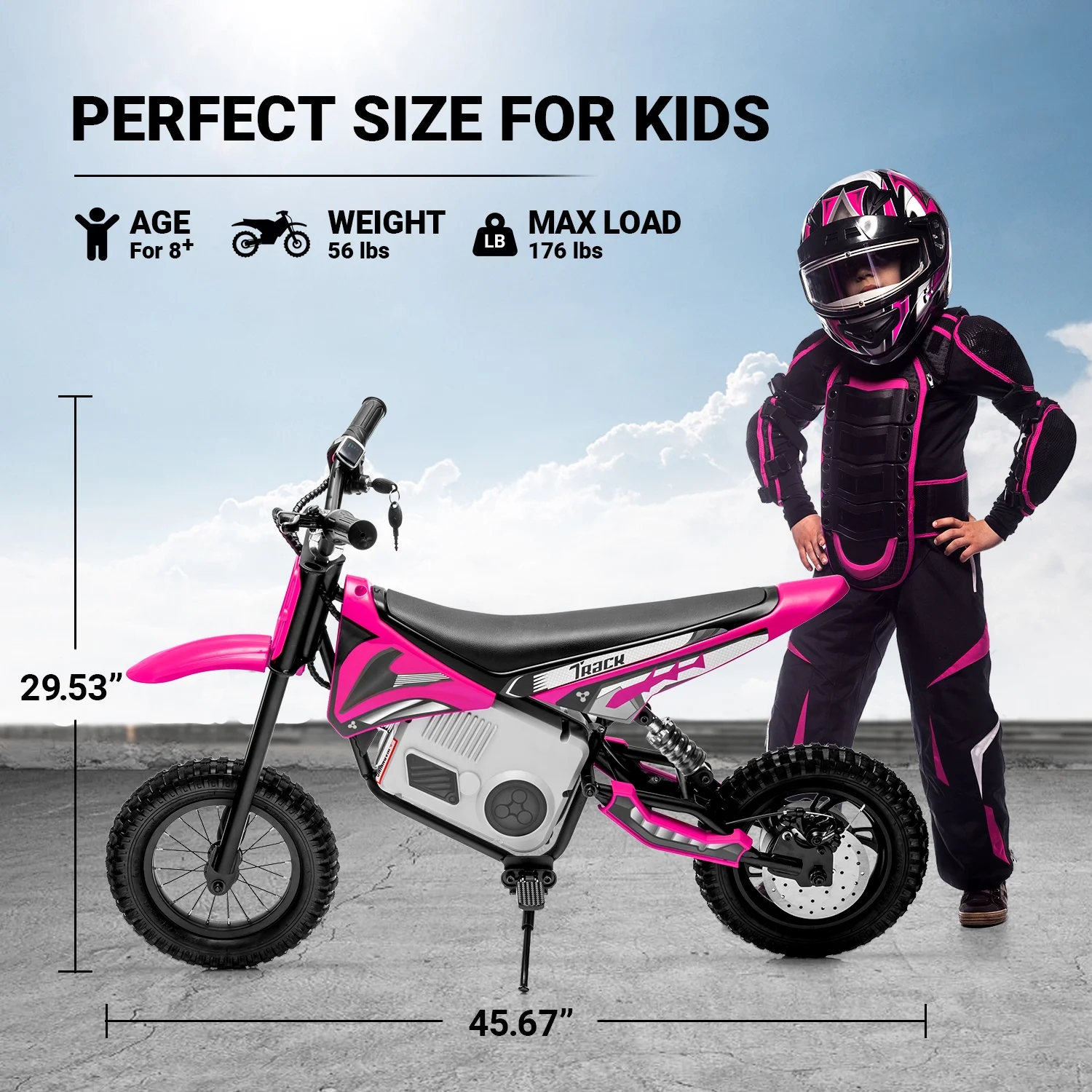 Track 7 36V Electric Dirt Bike for kids, 350W Ride on Motorcycle with Twist Grip Throttle, Hand-Operated Brakes, Key Start, Off-Road Motocross Speed Up to 15 MPH, Age 8+, Pink