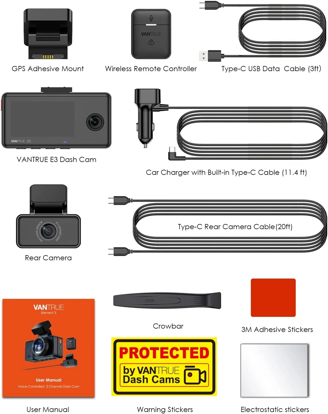 $240.79【Three-channel Dashcam for 100% Protection】Featuring the Novatek dual chip, the triple cam simultaneously records the front cabin and rear of the car at 1944P+1080P+1080P@30FPS providing total coverage of your car protecting you from traffic disputes and fraud. The innovative 55° rotatable front lens design accommodates most windshields and mounting angles. The optional CPL filter can eliminate lens flares for enhanced color clarity, giving you the best visual experience.【Dual Recording Dash Camera】The dual dash camera simultaneously captures the front and cabin or front and rear in crystal clear view at 1944P+1080P@30fps, which it’s all you’ll ever need from the dual camera and provides double protection for your safety and ensures a safer daily driving environment.【Infrared Night Vision】The 2-channel dash cam interior facing camera with 4 infrared LED lights, which can accurately capture the driver and passengers in low light. Equipped with WDR and HDR technology and upgraded STARVIS image sensors in the front camera, the dash camera will automatically balance the light and dark areas and capture clear videos and image footage even in poor lighting conditions at night. Extremely suitable for Taxis, Uber, Lyft, rideshare, and families.【Inbuilt WiFi & GPS Speed】 The inbuilt 2.4GHz/5GHz Wi-Fi brings faster transfer speed, and allows you directly to live view, configuration, file browse, download, and share the happening on road to social media and community easily on your phone via Vantrue Free APP! The included GPS module accurately records your driving route, location, speed, and time in real-time, and allows you to check the exact GPS information on google Maps via Free Vantrue Player and APP.【Hands-Free Voice Control&Wireless Controller】 Comes with multiple basic voice commands(only available in English, Japanese, Russian and Chinese), and you can simply give voice commands to save video, take photos, start the video, and turn on/off audio/ WiFi/screen while driving. The wireless Controller lets you easily capture beautiful scenery during the trip and quickly lock emergency videos, which gives the need hands-free and improves the convenience of using the cam, making driving safe.【7/24 Parking Mode】In buffer motion detection, once detect movement, the cameras will automatically record 15 seconds before the event and 30 seconds after it occurs. While in low frame rate, the camera will enter the 1-second 1-frame delay recording state and low bitrate recording mode enables the dash cam to record at 720P@15fps or 1080P@15fps continuously in parking mode, which greatly saves storage space and for longer recording. A hardwire kit (buy separately) is required.【Reliable Witness for Accident】Loop recording auto overwrites the oldest file when the card is full. Variable sensitivity G-sensor auto detects sudden shake/collision and emergency locks the videos for disputes. The built-in supercapacitor makes its power source built to last and can withstand an extreme temperature range from 14°F to 158°F without blunting performance. In Time Lapse, the camera will capture frames for a time-lapse video of a long journey, greatly saving your sd card space.【Easy to Install】Simple to mount the front and back dash cameras on the windshield which makes for an overall straightforward installation process. It comes with an extendable 18-month warranty, customer support through email within 24 hours, and a 100% satisfaction guarantee. Capable of housing up to 512GB of external memory (not in the box, recommend Vantrue sd card).