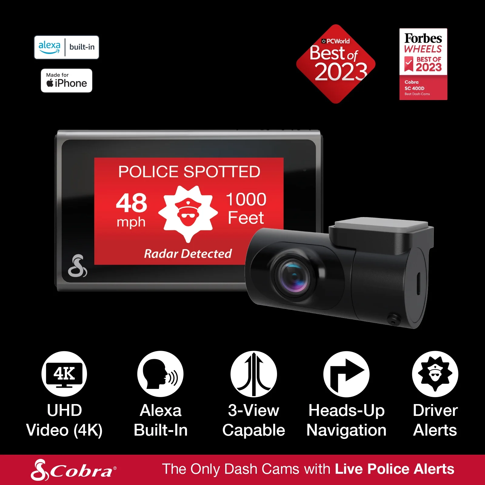 $343.96Original price was: $343.96.$239.94Current price is: $239.94.Cobra SC 400D Smart Dash Cam + Rear Camera with UHD 4K Resolution, Wi-Fi, Bluetooth, GPS + Apple CarPlay® & Android Auto® Integration The Ultimate Solution to All of Life’s Blind Spots Whether you’re on the road or parked, a commercial driver or commuter, hauling cargo or chauffeuring kids – you’re covered. With easily sharable 4K UHD resolution, virtual assistance built-in, navigation, live police alerts, 3-camera capability, and more – there’s no better way to protect the vehicles, drivers, and passengers you value most. See just how much peace of mind the award-winning Cobra SC 400D can provide. Your Travel Guide & Your Camera Crew Cobra SC Series dash cams are designed to protect you against life’s blindspots: past, present, and future. That’s why they’re the only dash cams that feature both trip-planning and heads-up navigation, meaning you’ll never have to look down at your phone while you’re behind the wheel. While an ordinary dash cam can tell you where you’ve been, only the SC series dash cams can show you where you’re headed. The Best Defense is a Sensor-Based Offense We engineered our dash cams to protect you from anything that happens on the road. That’s why they’re the only dash cams that can display upcoming speed traps from a sensor-based network that’s more accurate than the leading crowd-sourced app. Connect to the new & improved Drive Smarter® App community to get live, shared alerts from other detectors and drivers across the country. Plus, with Apple CarPlay® & Android Auto® compatibility, you can easily view your route and interact with alerts on your vehicle’s display.