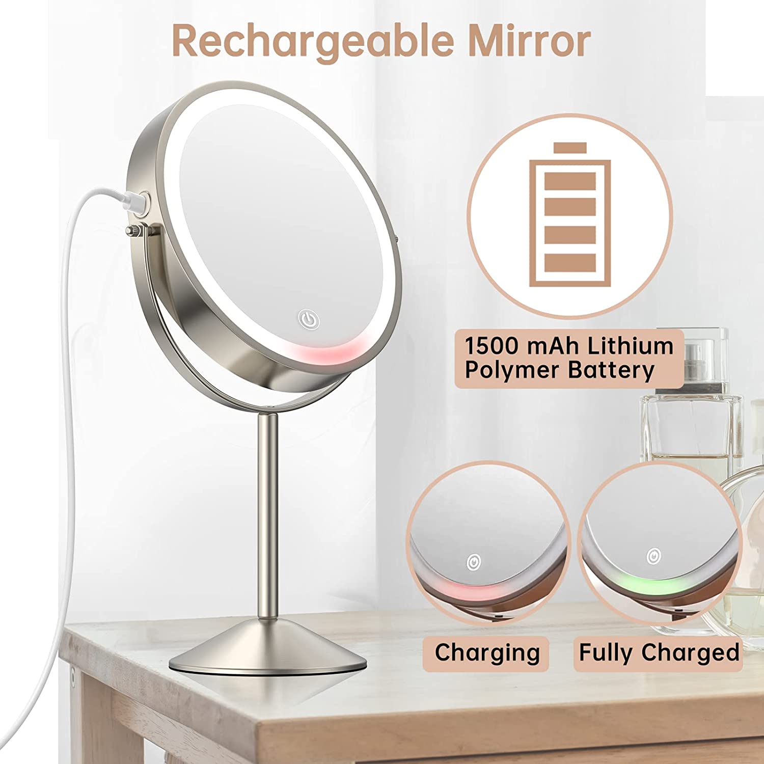 Houflody 8 Inch Lighted Makeup Mirror 1X/10X Magnifying LED Makeup Mirror 3 Color Dimmable Lighting Modes Rechargeable Cordless Cosmetic Mirror with Touch Control Vanity Mirror 360° Rotation(Nickel)