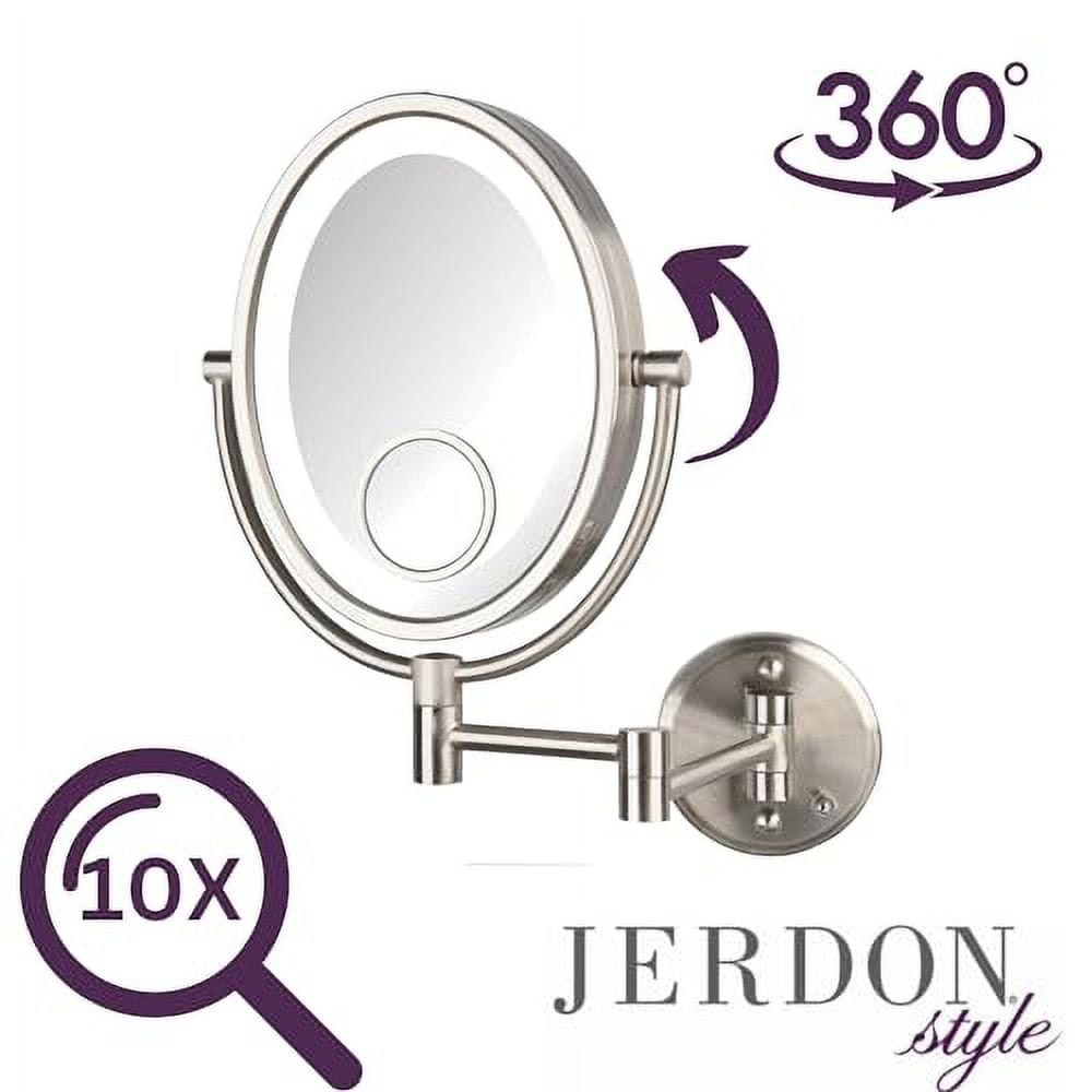 Jerdon 8 inch by 10 inch Oval Wall-Mounted Lighted Makeup Mirror with 10X-1X and 15X Spot Magnification, Nickel Finish, Direct Wire -Model HL9515NLD