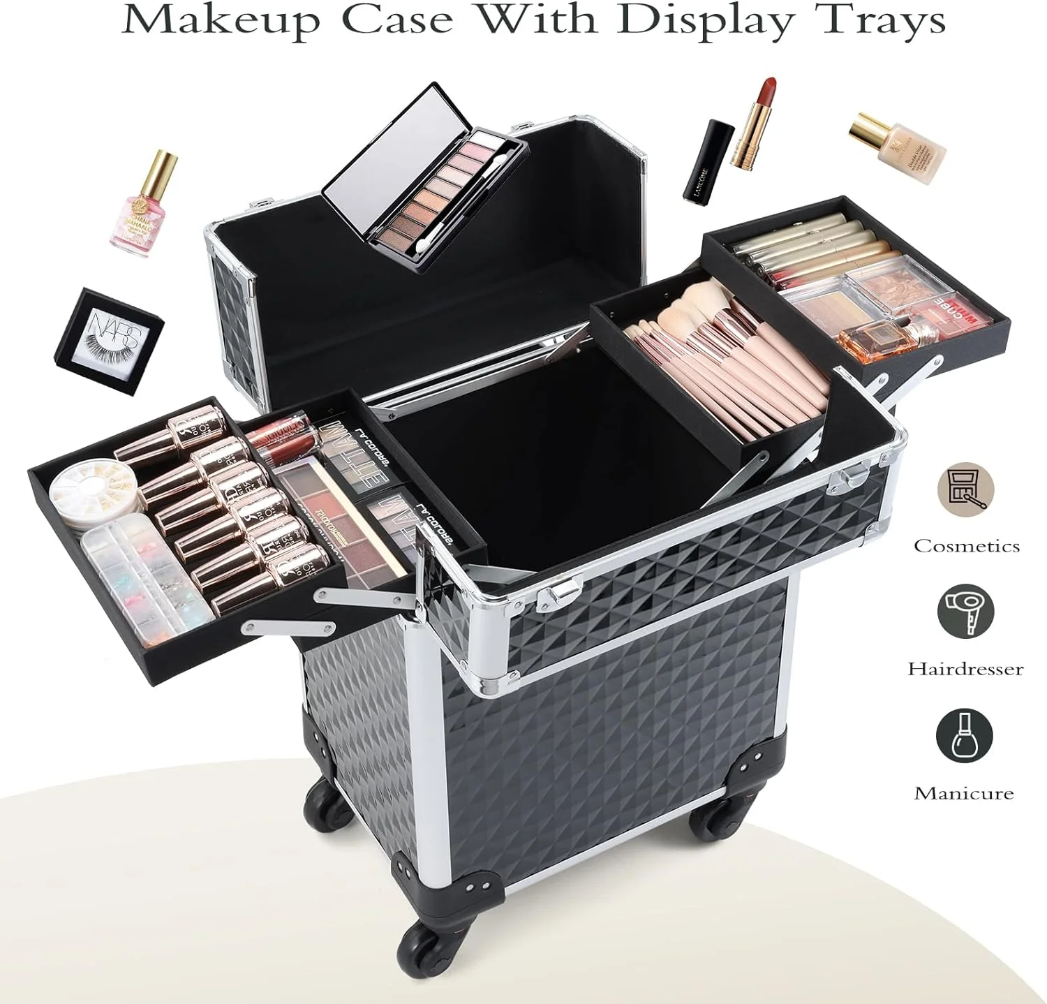 $76.88This rolling makeup train case with detachable wheels for carrying the make-up while going out. This professional makeup case organizer made of premium ABS and aluminum alloy frame, this makeup rolling case is sturdy enough for long-term use. With a multiple-tray design, all your basic makeups will have their exclusive room. It is perfect for beauty professionals, students, and hair stylists, as well as for personal use.