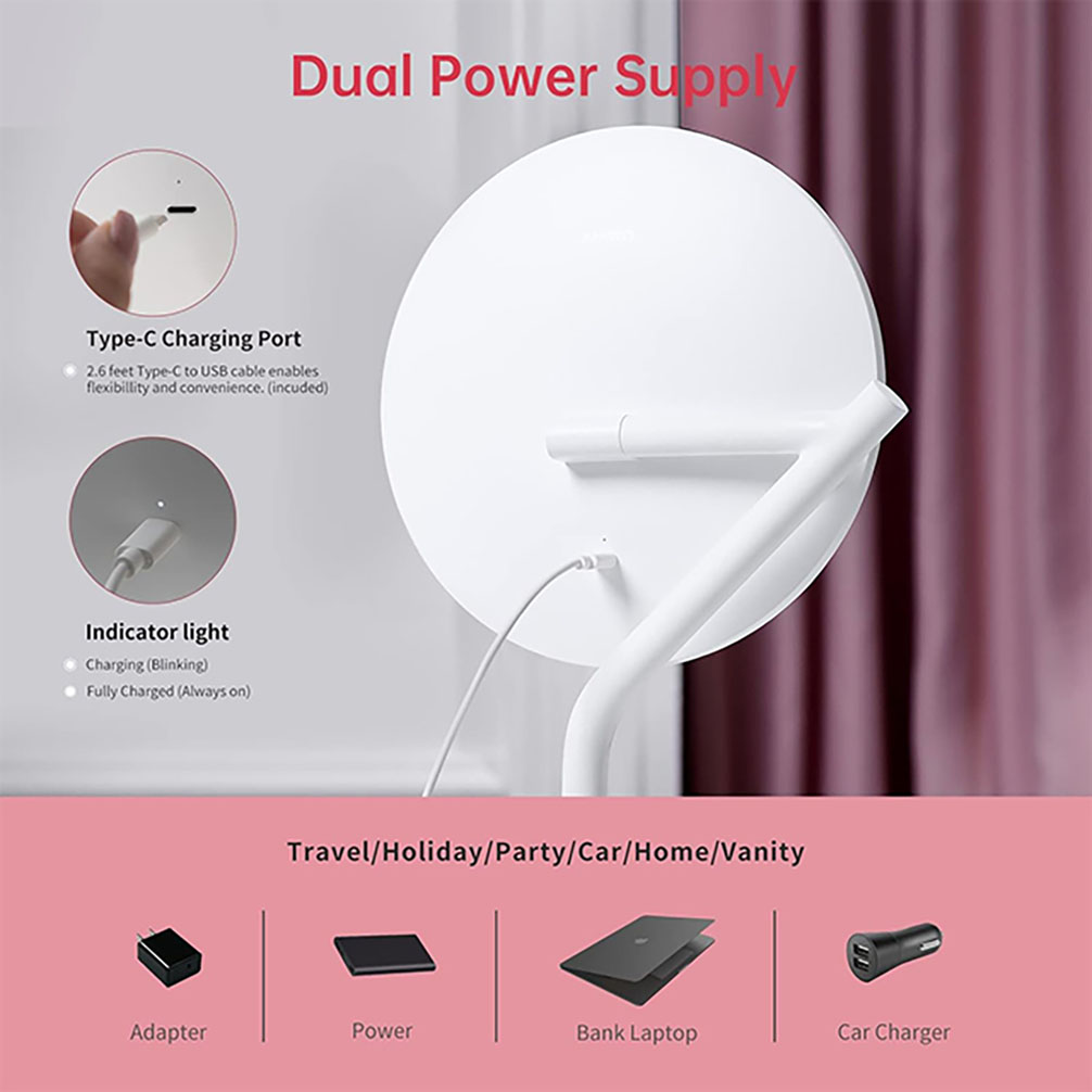 $42.99The lighted makeup mirror has ultra high CRI 97, 1100lux high definition, and has up to 95% daylight similarity. Providing white light, warm light, cold light and brightness adjustment, the light is soft and can cover all corners of your face. Short press the sensor switch to change the color of the light, press “+/-” to adjust the brightness of the light, meet all your needs in different environments. The vanity mirror also has memory function, it will remember the last brightness you need.