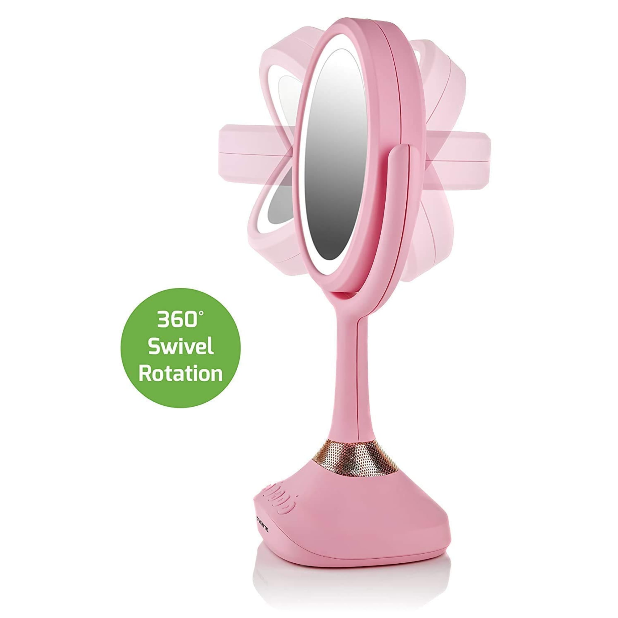 OVENTE 6” Lighted Round Vanity Mirror, Table Top, 360 Degree Spinning, 1X 5X Magnifier, MP3 Audio, Baby Pink MRT06P1X5X