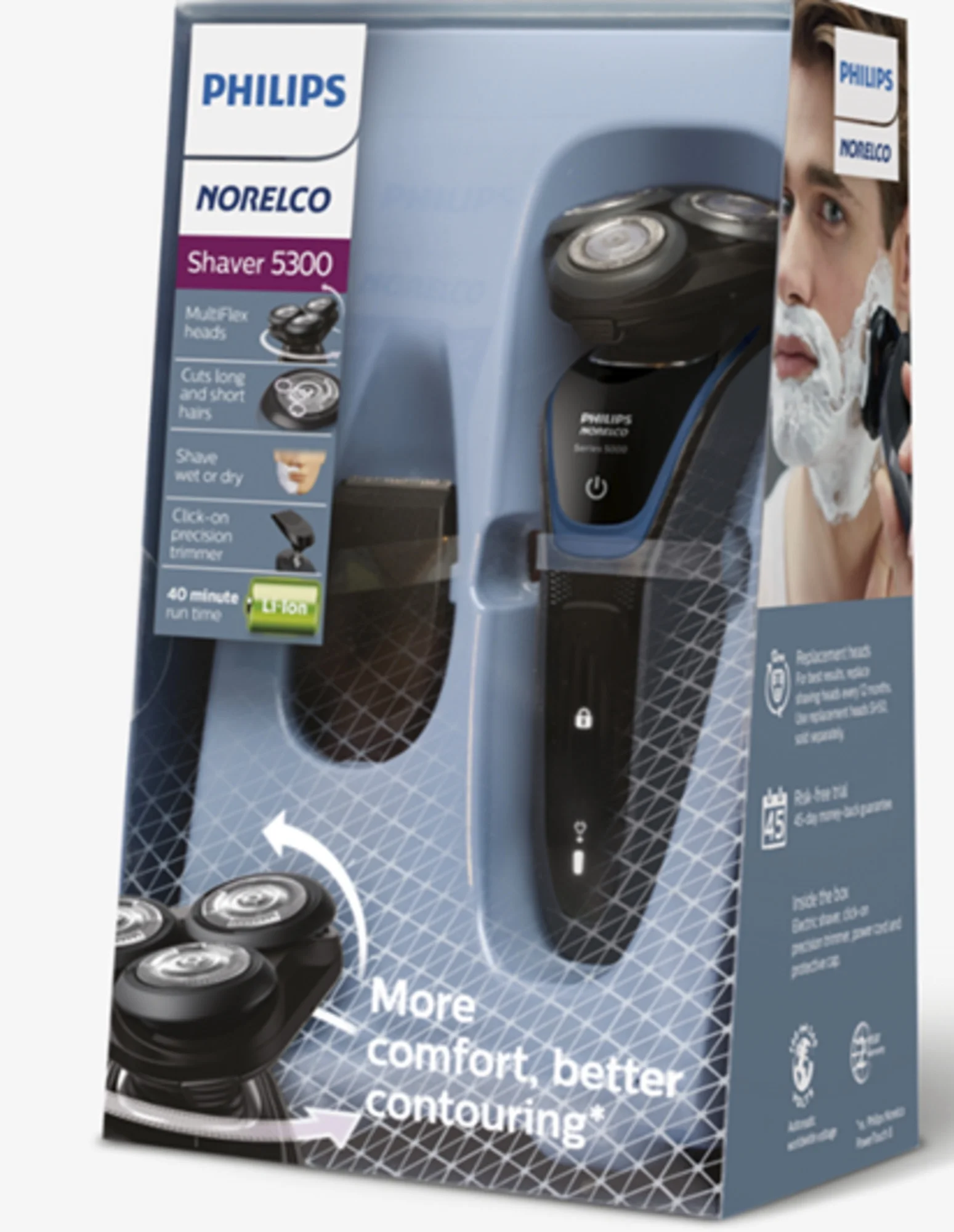 $85.91Original price was: $85.91.$72.51Current price is: $72.51.Philips Norelco Shaver 5300 adds more comfort to your morning routine. MultiFlex heads adjust to the angles of your face with 5 independent movements. The entire head pivots and the individual shave heads flex to maintain skin contact and catch hair in hard-to-reach areas. The MultiPrecision Blade system raises and cuts long hairs, flat-lying hairs and short stubble in just a few strokes. Get a convenient dry shave or a more refreshing wet shave with gel or foam, even in the shower. Finish your look with the click-on precision trimmer, which is ideal for maintaining your mustache and trimming your sideburns.A powerful Li-ion battery delivers 40 minutes of cordless shaving and fully charges in 1 hour. A 5-minute quick charge provides enough power for one shave. One-touch open allows for easy cleaning; simply pop-open the heads and rinse with warm water. The intuitive display shows relevant information, enabling you to get the best performance out of your shaver: 1-level Battery Indicator, cleaning indicator, battery low indicator, and replacement head indicator. Electric shaver, click-on precision trimmer, power cord and protective cap