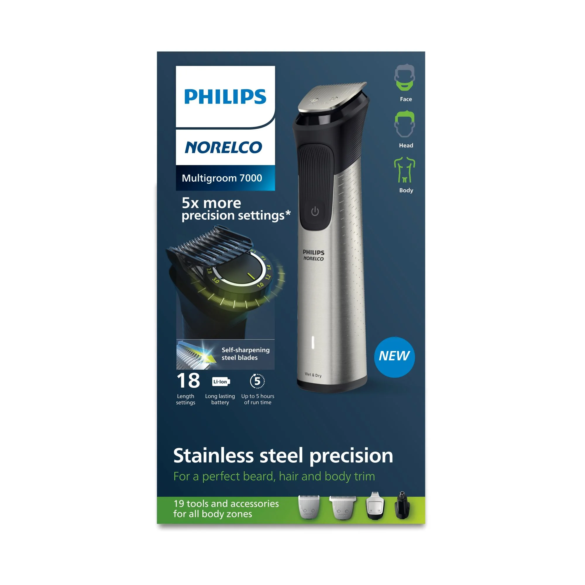 $51.57The Philips Norelco Multigroom 7000 provides stainless steel precision with 19 tools and accessories for a perfect beard, hair, body and below-the-belt trim. The precision trimming guard provides 5x more precision settings vs the predecessor. The Multigroom 7000 also has Smart BeardSense technology to boost power exactly when you need it to tackle dense, bushy or long beards. The self-sharpening stainless steel blades remain sharp as day one for long lasting performance, no oil required. Plus, the steel frame and rubber grips deliver superior control and the Lithium-ion battery yields 5 hours of runtime. USB-A charging cable included (wall power adapter not included). 1 steel trimmer, 1 adjustable 1-3mm precision trimming guard, 1 steel precision trimmer, 1 nose and ear trimmer, 1 extra-wide hair trimmer, 4 hair trimming guards, 2 beard trimming guards, 2 fading hair guards, 2 body trimming guards, an eyebrow trimming guard, a storage bag, a cleaning brush, usb-a charging cable (wall power adapter not included)