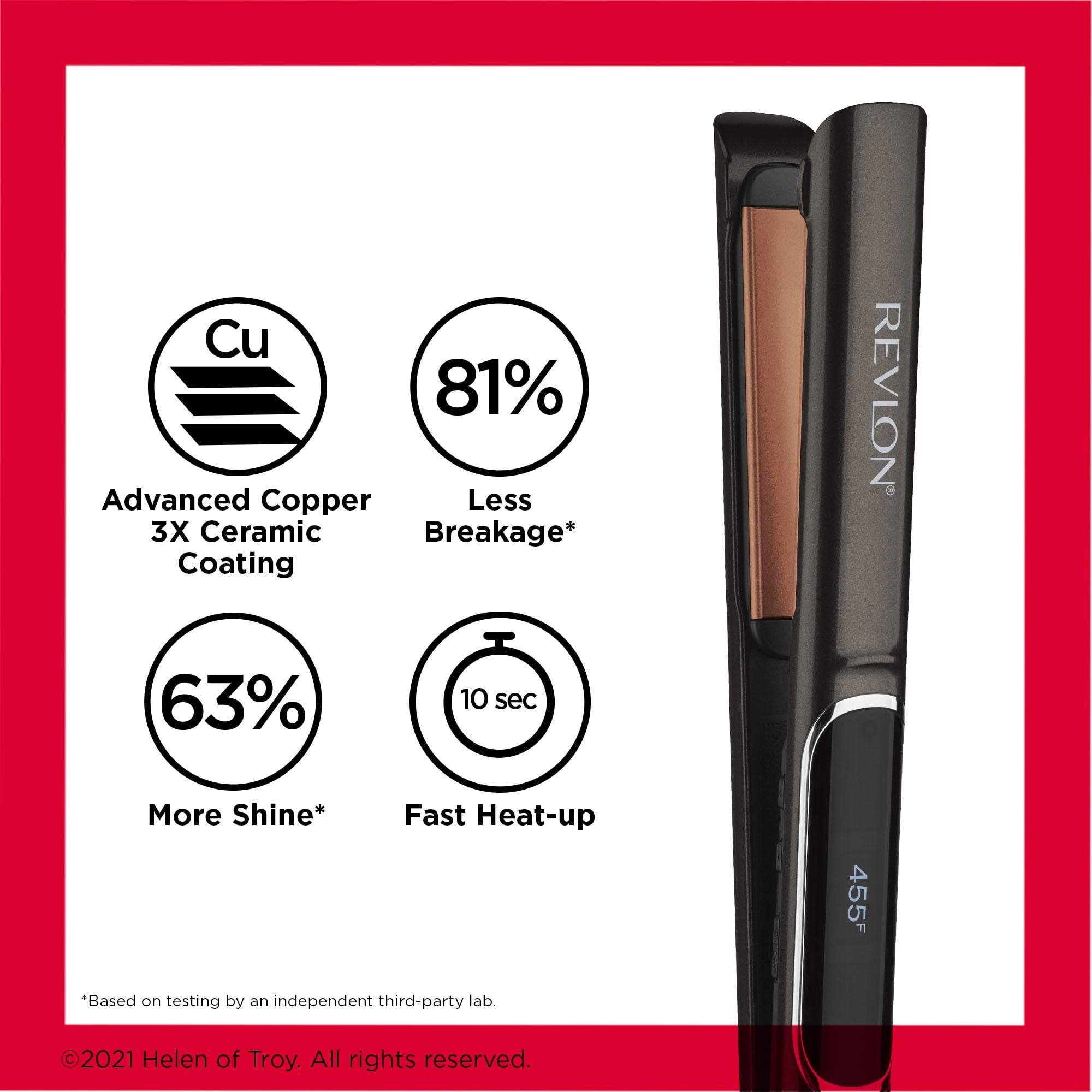 $36.11Revlon Hair Tools is dedicated to helping women achieve beautiful hair they’ll love! Whether women desire gorgeous blowouts, big enviable waves, striking straight locks, or the perfect fashion accessory to complete the look, Revlon has the styling tools you desire. Our innovative Pro Collection line will provide you with the latest technology to help you achieve desired results fast! ABOUT THE PRODUCT: Achieve smooth, straight, shiny styles in no time with 10-second fast heat-up and digitally precise heat settings up to a professional-level 455 degrees F. High heat is transferred evenly and quickly to help protect hair from over-styling with the Advanced 1″ Copper styling surface that provides superior heat transfer and durability. The sophisticated Smart-Heat Memory System automatically recalls your last preferred heat setting and True Grip rounded plates create loose curls or waves in any hair type. Get 81% less breakage, 63% more shine and silky, superior results. Complete with auto dual voltage for worldwide use. 81%- Based on testing by independent 3rd party lab 63%- Based on testing by independent 3rd party lab.