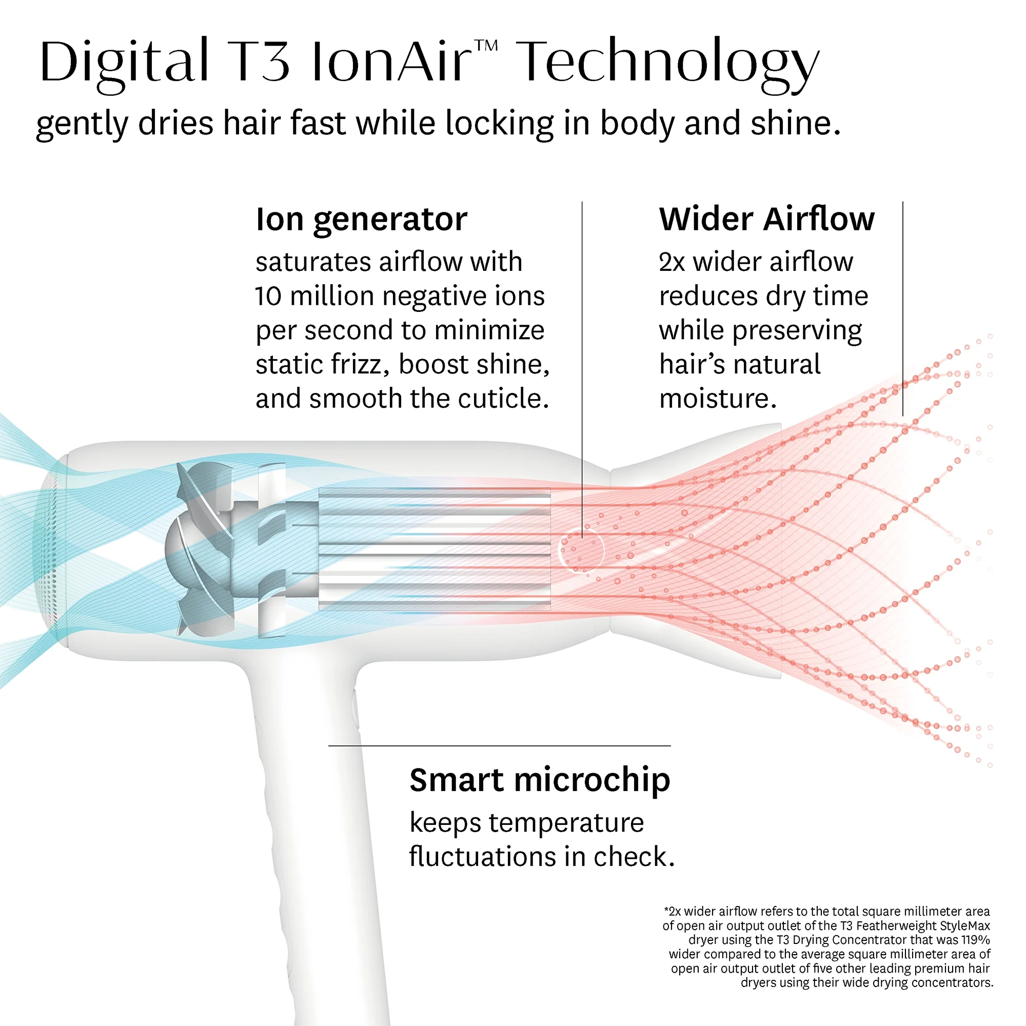 $180.59Less time. Less frizz. More hydration. Your superior drying experience has arrived. The T3 AireLuxe professional hair dryer features a custom-engineered fan that propels a 128% wider airflow1 to significantly reduce dry time, while enveloping hair in a gentle airstream designed to help retain 60% more of its natural moisture.2 A powerful ion generator infuses hair with 10 million negative ions per second to banish frizz and boost shine, and a smart microchip digitally controls 15 heat and speed settings for minimized heat exposure, reduced damage3 and personalized styling for every hair type. Now 30% quieter,4 T3 AireLuxe is compatible with four different attachments5 to create a variety of looks that last. Hydrated, frizz-free hair has never been this easy—or this fast. Other features include: Volume boost switch; Drying & Styling Concentrators, Lock-in Cool Shot, 9 ft. Cord with Cord Wrap; 2-Year Warranty. 1 128% wider airflow refers to total square millimeter area of open air output outlet of the T3 AirLuxe dryer using the T3 wide concentrator compared to the average square millimeter area of open air output outlet of five other leading premium hair dryers using their wide drying concentrators. 2 60% more moisture refers to the higher total retained moisture level of a damp canvas after 5 minutes of drying with the T3 AireLuxe compared to the average retained moisture level of a damp canvas after 5 minutes of drying with four other leading premium hair dryers. 3 Based on a 3rd party panel study of 110 participants, 93% reported that they experienced less damage when using the AireLuxe hairdryer vs. their current hairdryer. 4 Compared to T3 Cura hairdryer 5 Drying concentrator and styling concentrator included. Diffuser and Smoothing Comb attachment sold separately