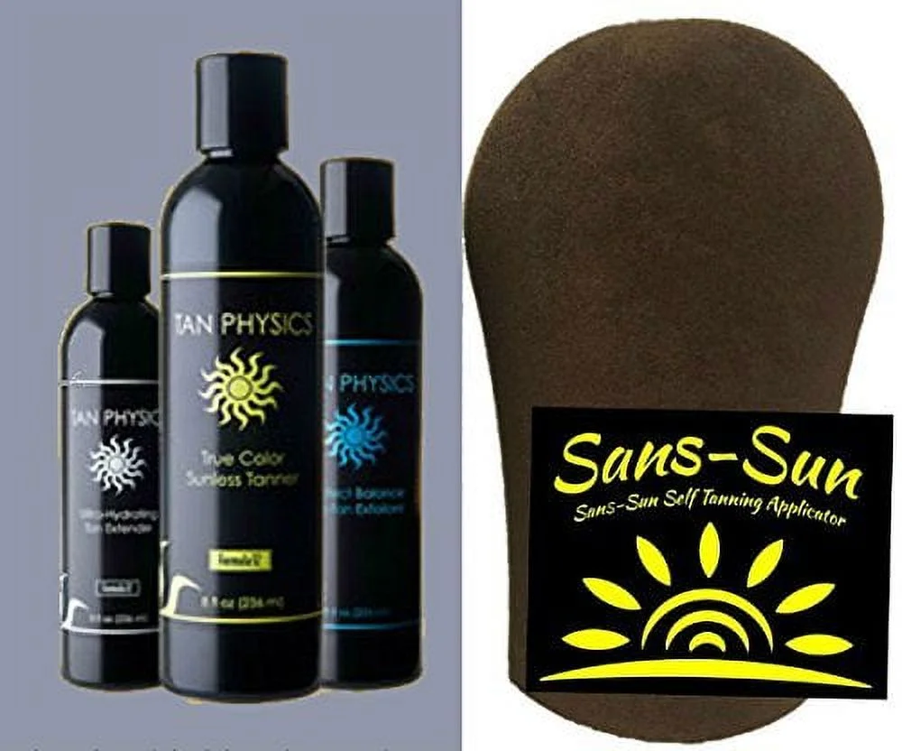 $129.85Tan Physics True-Color Formula 12 is perfectly formulated to provide you with a rich and natural looking tan that will exceed even your highest expectations. Specially formulated, the included Sans-Sun Tanning Mitt, applies a smooth even layer of tanning lotion with out streaking or staining your hands. Sans-Sun also absorbs much less sunless tanner than other tanning mitts saving you both time and money. Why purchase Tan Physics and the Sans-Sun Tanning Mitt: Your skin deserves to be pampered The replenishing and dark tanning properties of Tan Physics provide a healthy tan The micro fiber surface reduces drips and runs The Sans-Sun Mitt paired with Tan Physics ensures a beautiful even, streak-free tan A barrier layer in the Sans-Sun mitt prevents the tanner from staining hands The Sans-Sun Mitt cleans easily with mild soap and water The Sans Sun Tanning Mitt makes the application of Tan Physics sunless tanning lotion quick and easy. Specially designed for the application of sunless tanners, the micro-fiber surface of the Sans-Sun mitt ensures a streak-free even tan every time. Hands stay clean and dry and free from staining because of the waterproof barrier inside the mitt. When finished your Sans-Suns Mitt is easily cleaned with soap and water. How to apply Tan Physics using the Sans-Sun Tanning Mitt Apply Tan Physics tanning solution to mitt Using a circular motion move mitt across skin with light pressure As needed apply more Tan Physics tanning lotion to your Sans-Sun Mitt Once the tanner has been applied to desired areas rinse the Sans-Sun Mitt in cold water using a gentle soap. Press any remaining water from Mitt and hang to dry. Avoid wringing your mitt.