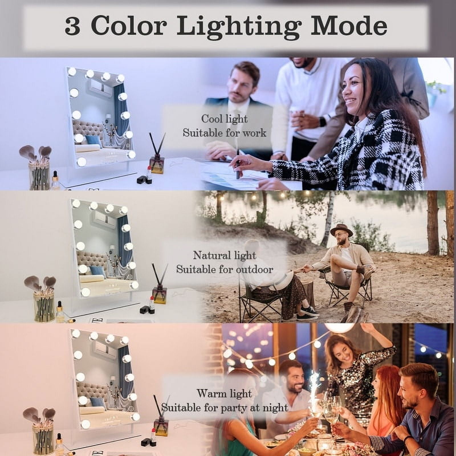 $55.88WLRETMCI Large Hollywood Vanity Mirror, Vanity Mirror with Lights with 10x Lens, Dimmable Led Bulb, 3 Color Light Modes. Large Vanity Mirror with Lights:The Hollywood vanity mirror is a must-have professional makeup aid for celebrities and makeup artists, and can also be installed at home. The frame of the makeup vanity mirror is made of high-quality tinplate, and the ivory white color is more stable and elegant. The vanity mirror allows you to complete your perfect makeup while enjoying the song, giving you a star-like feel and the vanity of your dreams. The Hollywood Vanity Mirror features adjustable brightness and 3 light colors (Cool White,Warm White,Warm Yellow) to help you create a flawless professional look. Product Information: Product Name: Vanity Mirror Frame: Tinplate Mirror Color: Ivory white Hanging:Support Voltage Input: 110-230V Voltage Output: 12V 1A Light:Cool White/ Warm White / Warm Yellow Bulb: 15*3W LED dimmable bulbs Mirror Size: 58*48cm Base:Detachable base √Wall Mounted or Tabletop WLRETMCI Large hollywood vanity makeup mirror is also space saver for your dressing table.It with two back hole for nail,can easily hang on the wall! √Dimmable LED light bulbs WLRETMCI Large hollywood vanity makeup mirror is dimmable light bulbs save power, Beautiful and Durable,and last up to 50,000 hours.The bulbs temperature is safe and not hot.It also remains stable over long periods of use.Protect you and your eyes. √USB Chargerng Port WLRETMCI Large hollywood vanity makeup mirror is power outlet with USB port is designed on the side of vanity mirror.It is convenient to charge your mobile phone or other USB device while making up. √10x Lens Function WLRETMCI Large hollywood vanity makeup mirror is exquisite makeup is one of the necessary conditions for a happy life every day. Hollywood make-up mirror is equipped with 10x Lens, making you a perfect makeup!