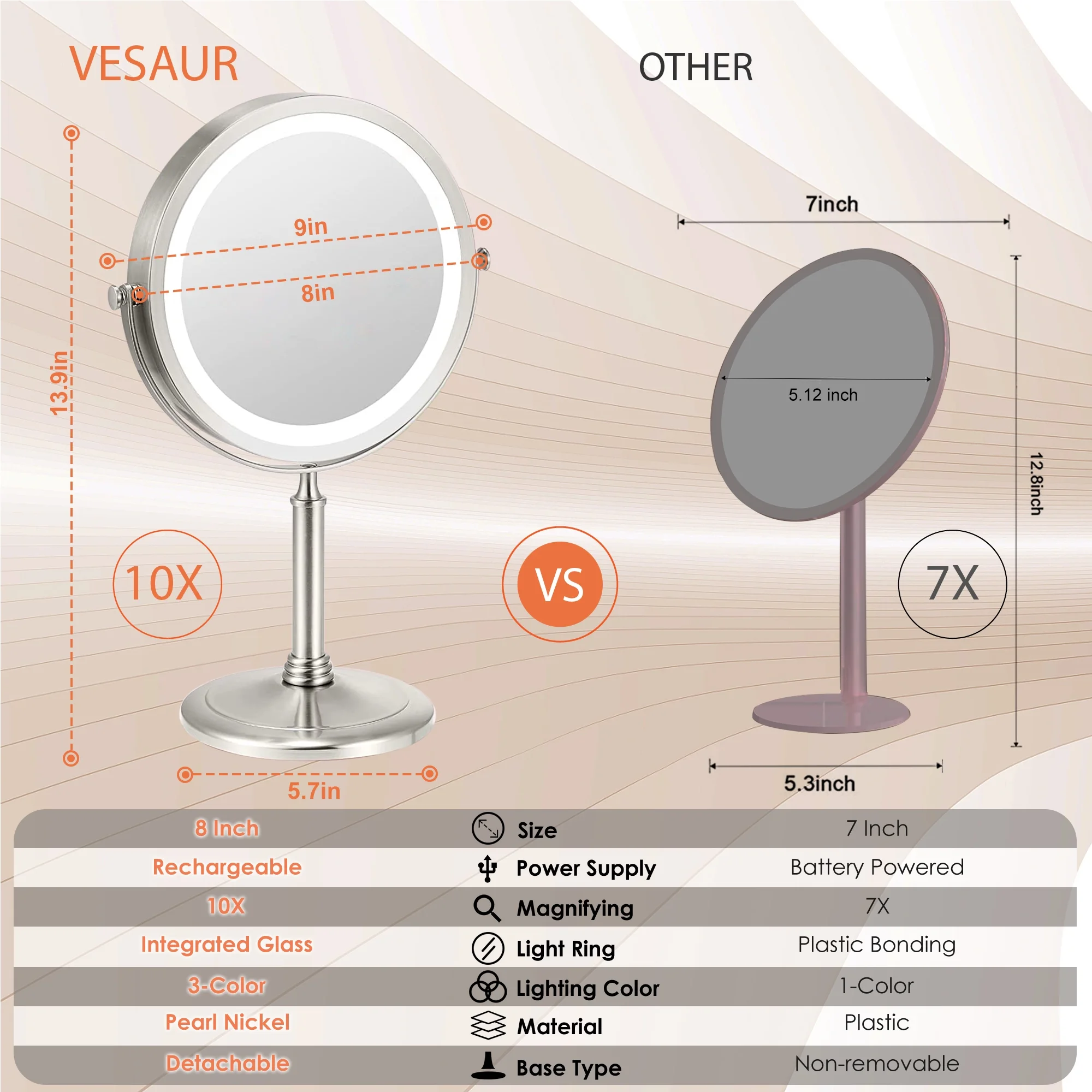 $20.35Original price was: $20.35.$17.33Current price is: $17.33.VESAUR professional 8 inch HD Lighted Vanity Mirror — 1X/10X double sided design, 360 degree rotation, 3 light modes, 2400 mAh usb rechargeable battery, detachable base , Ideal for travel and home, this is also a thoughtful and practical gift for your family or friends!
