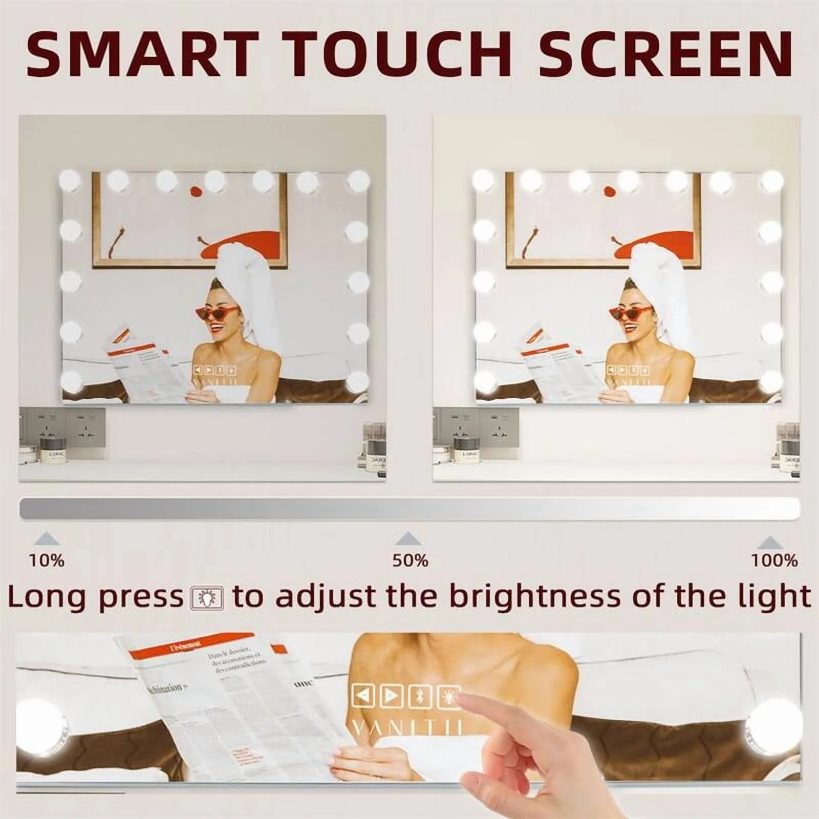 $48.15VANITII GLOBAL We are the USA Local brand, specialise in series of Vanity Makeup Mirror, Vanity Mirror with Lights Hollywood Mirror and Vanity Desk. This vanity mirror with lights has just the right size of 14.5” x 18.9”, you can see the entire face completely, which is very space saving when placed on the makeup table. Also included with this vanity makeup mirror are the 10X Magnifying mirror! Stylish makeup mirror with lights can rotate 360 degrees and has a non slip base, which means there is no risk of slipping. All you need in one vanity with lights set! LED VANITY MIRROR WITH SMART TOUCH CONTROL simply turn the light up mirror on/off, and adjust the brightness with dimmable settings for morning, afternoon or evening. Also choose between 3 makeup light color temperatures, from warm to cool to get the cleanest reflection possible.